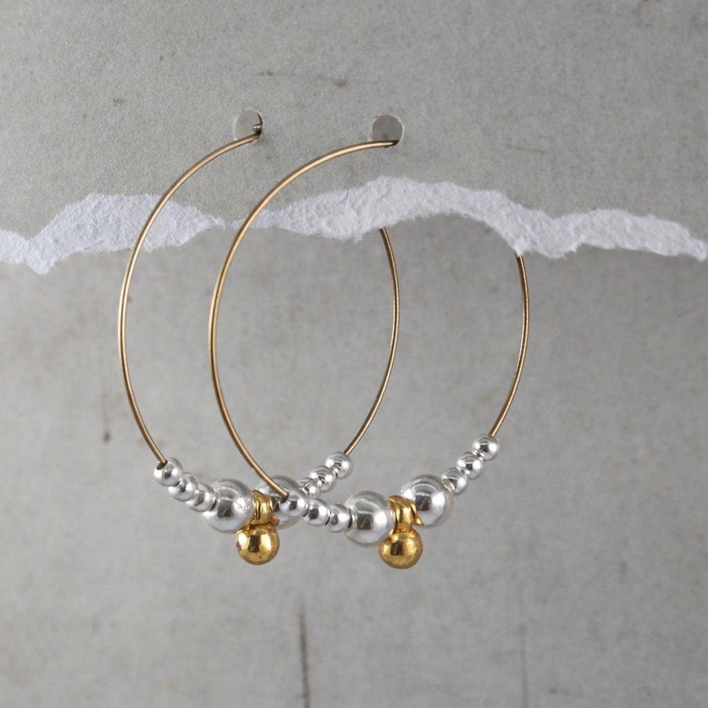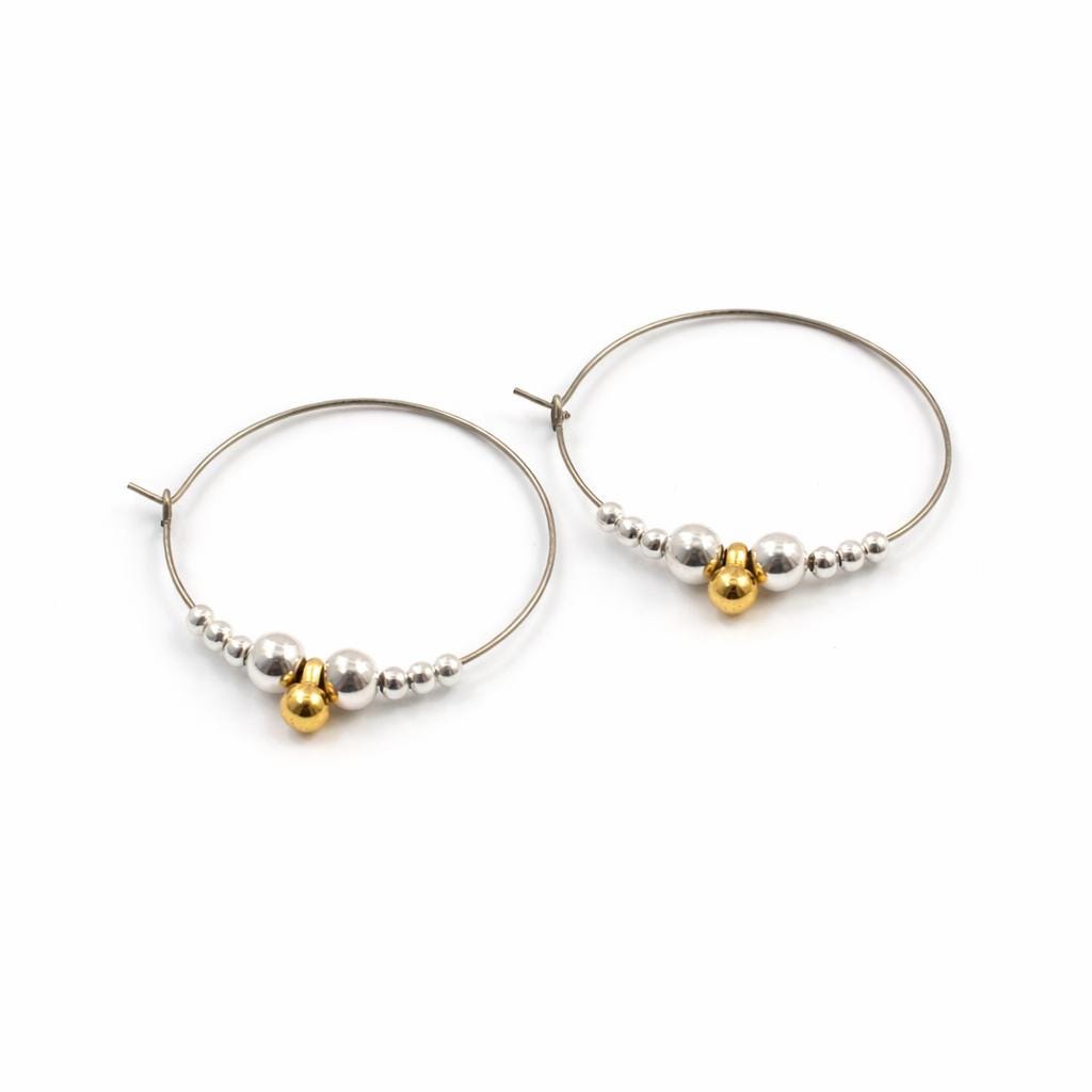 Fines boucles d'oreilles créoles en laiton bronze garnies de perles en métal (alliage) doré et argenté.