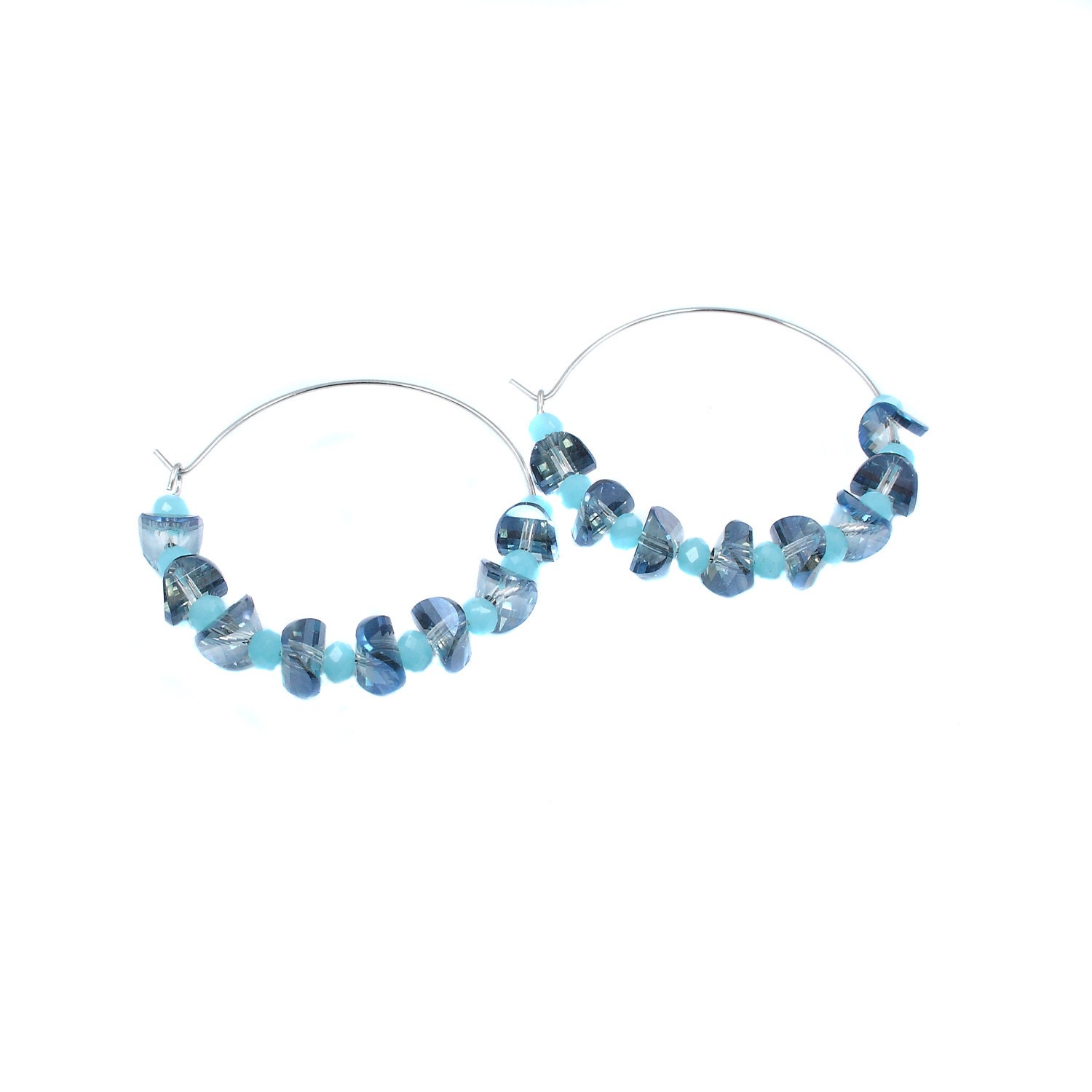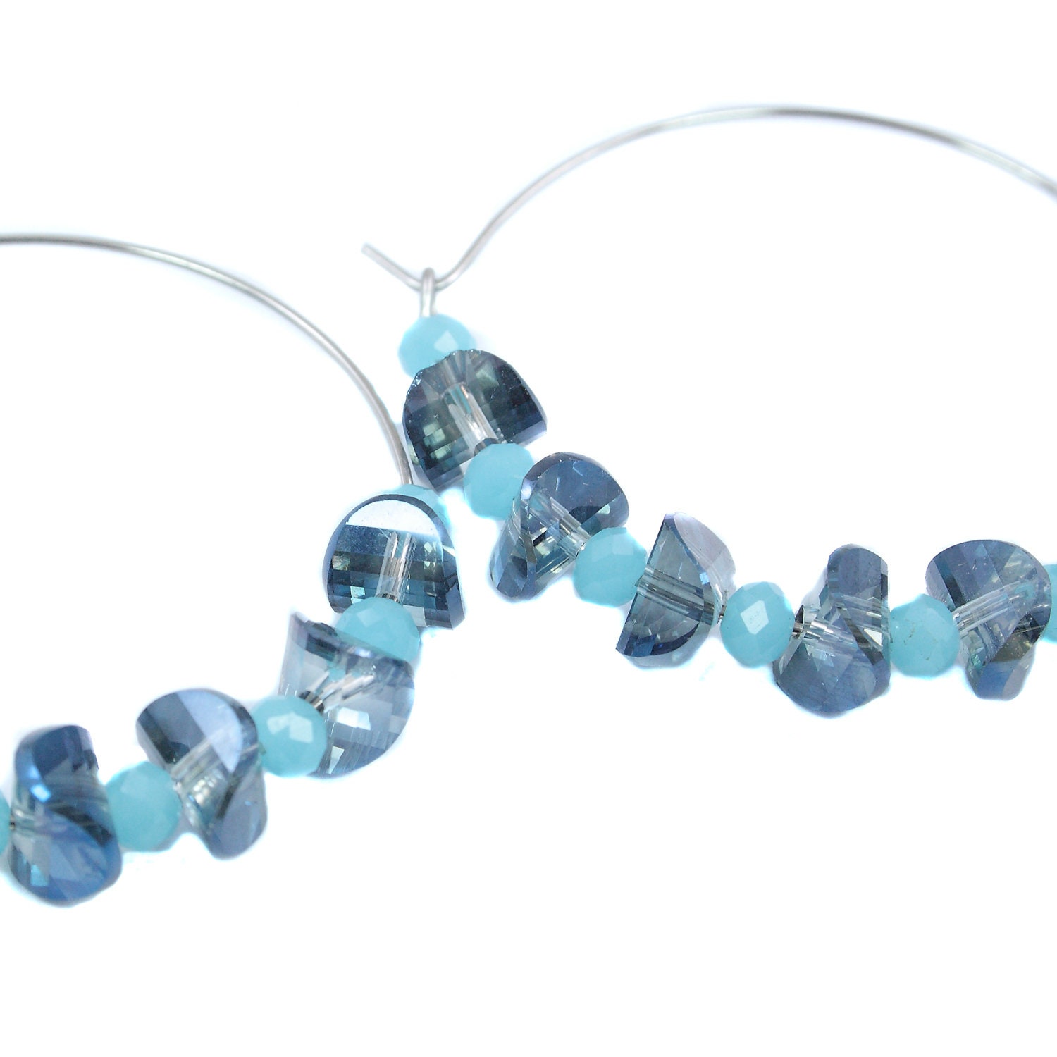 Stainless steel hoop earrings with vintage blue and white glass beads.