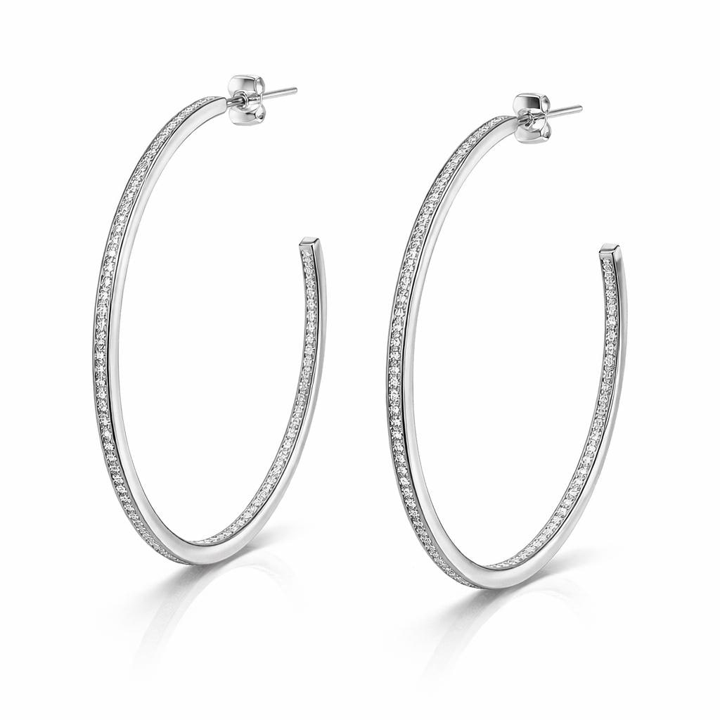 Thin open hoop earrings in silver alloy and white zircon rhinestones.