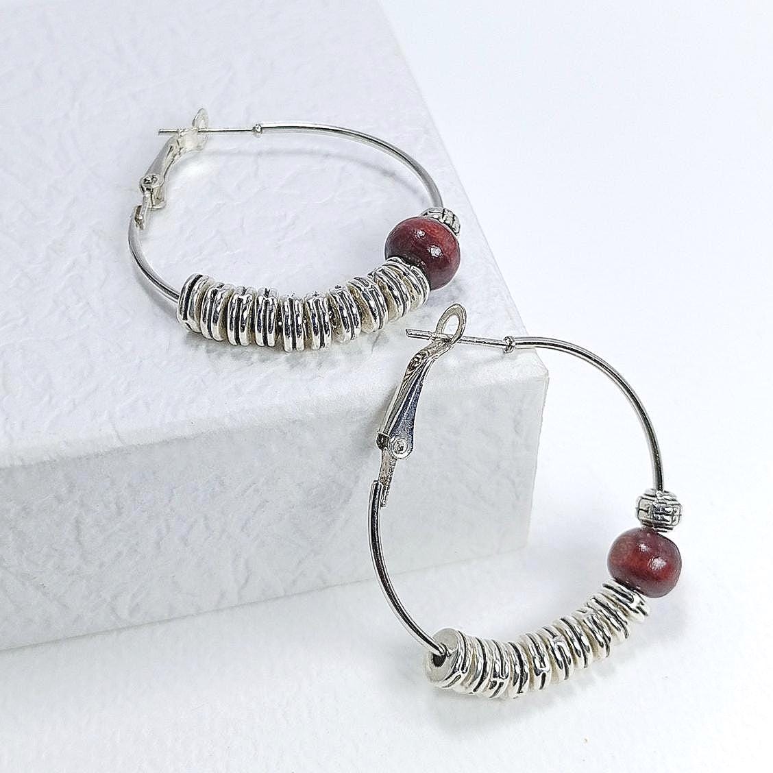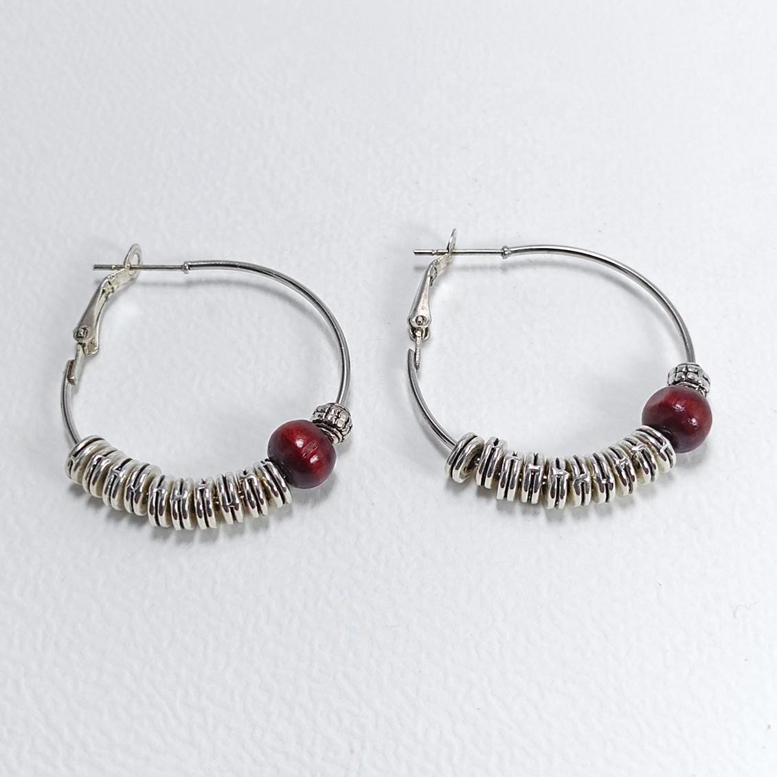 Silver-plated brass hoop earrings, adorned with a wooden bead and mini antique silver-plated brass beads.