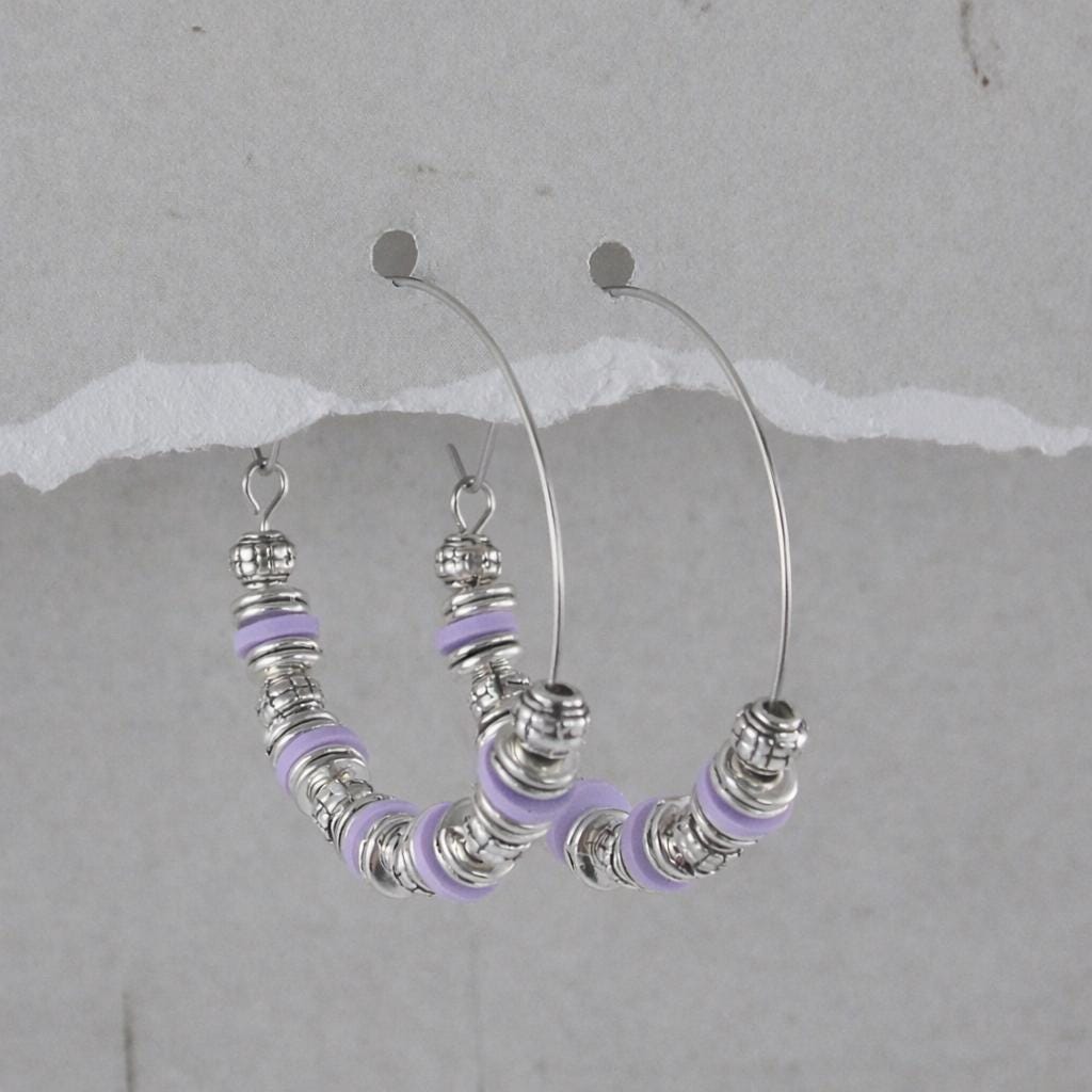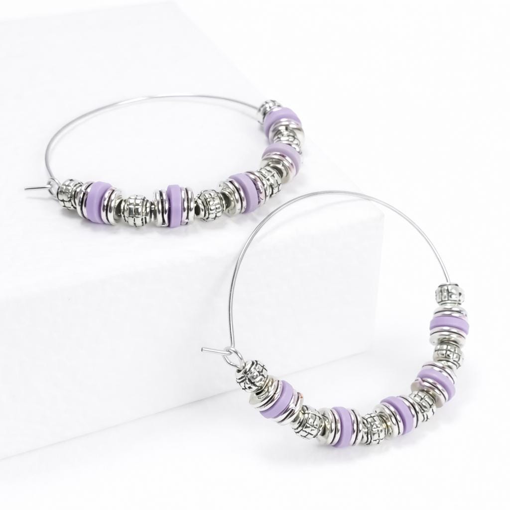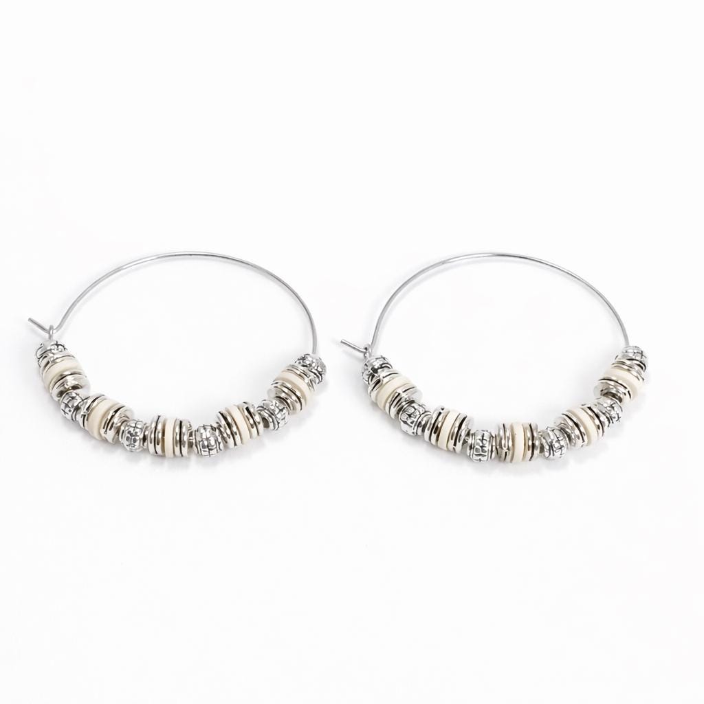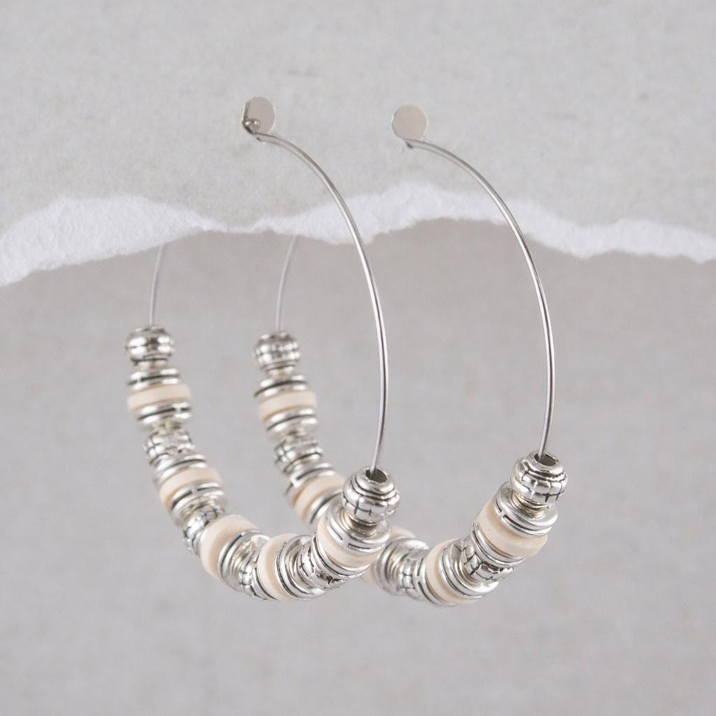 Stainless steel hoop earrings, "old silver" metal beads and silicone washers.