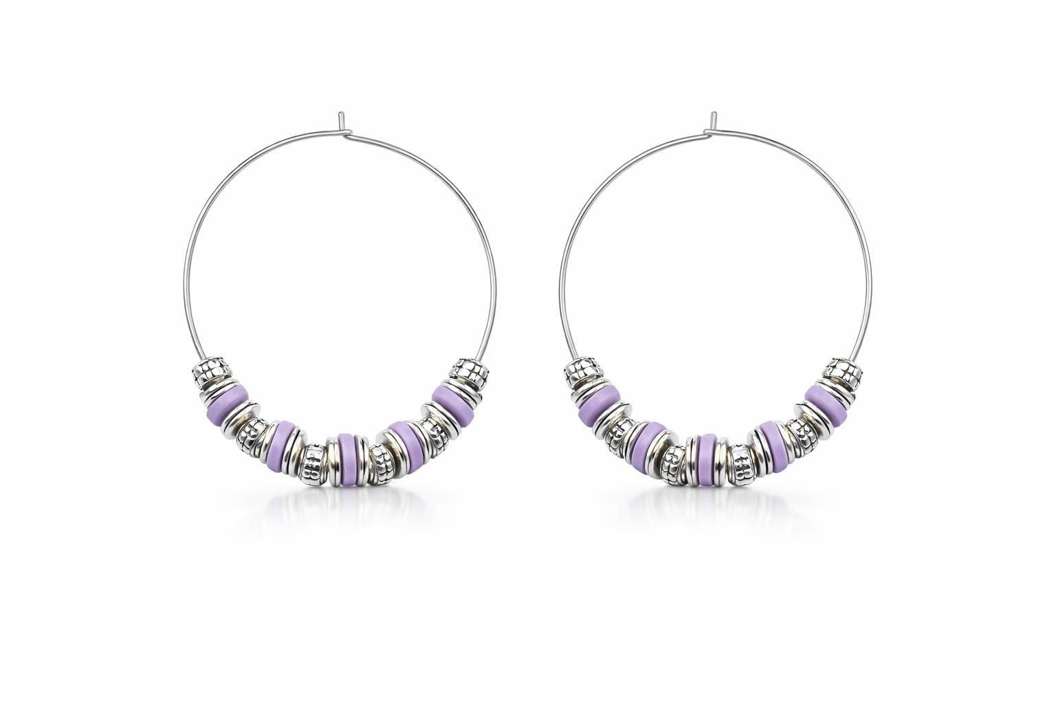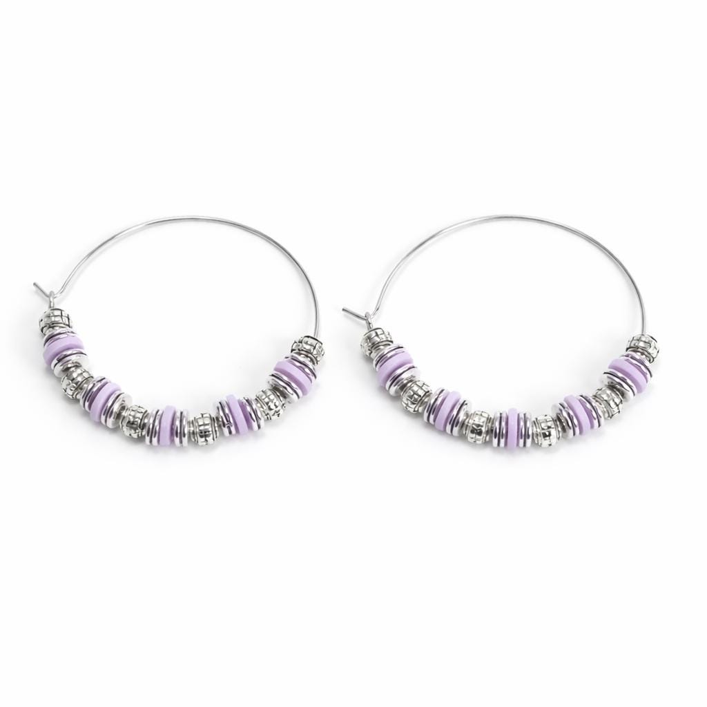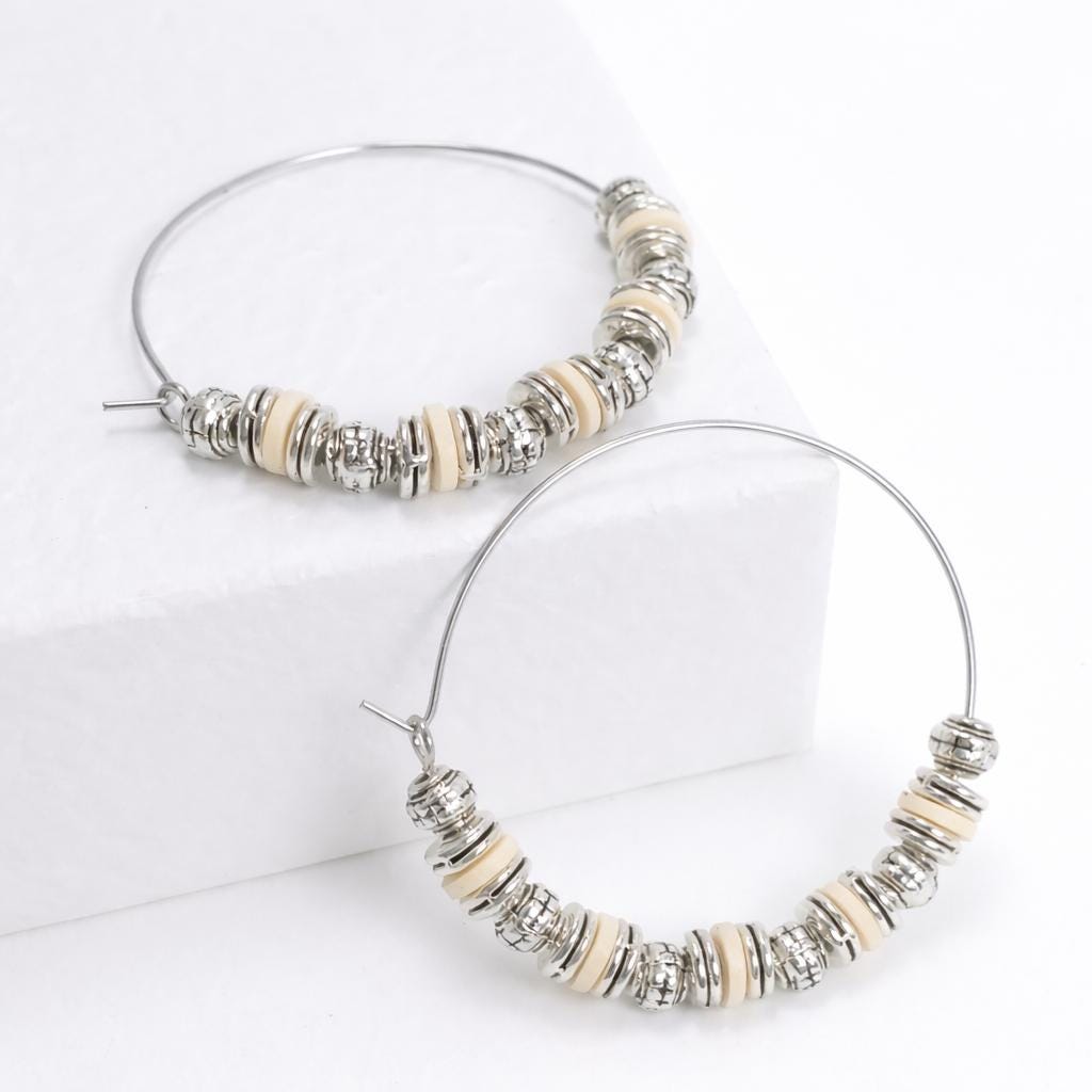 Stainless steel hoop earrings, "old silver" metal beads and silicone washers.