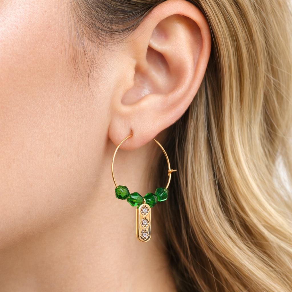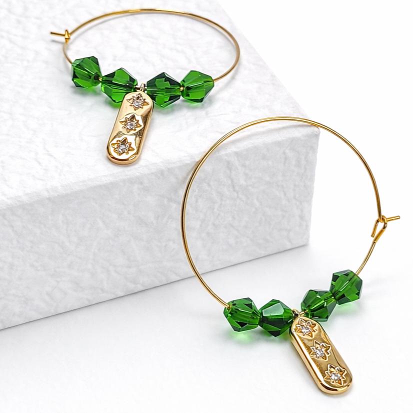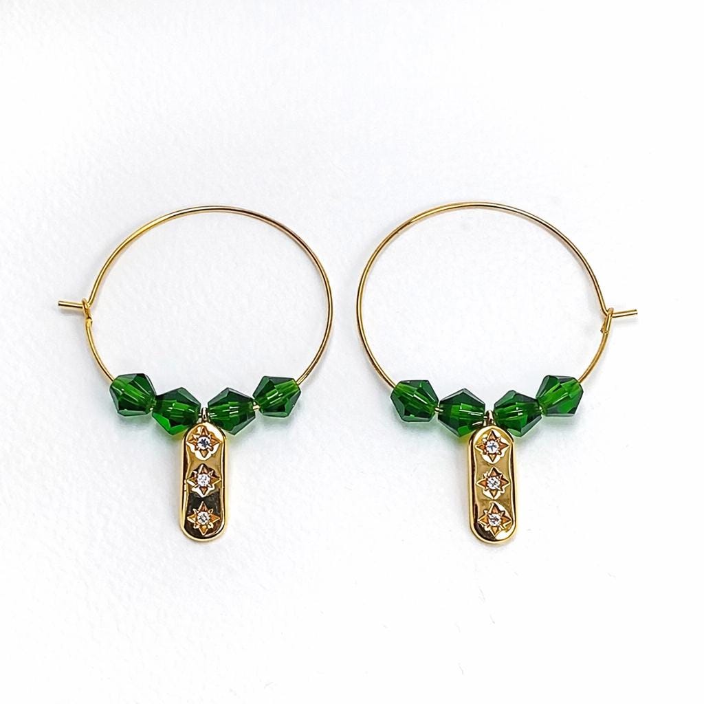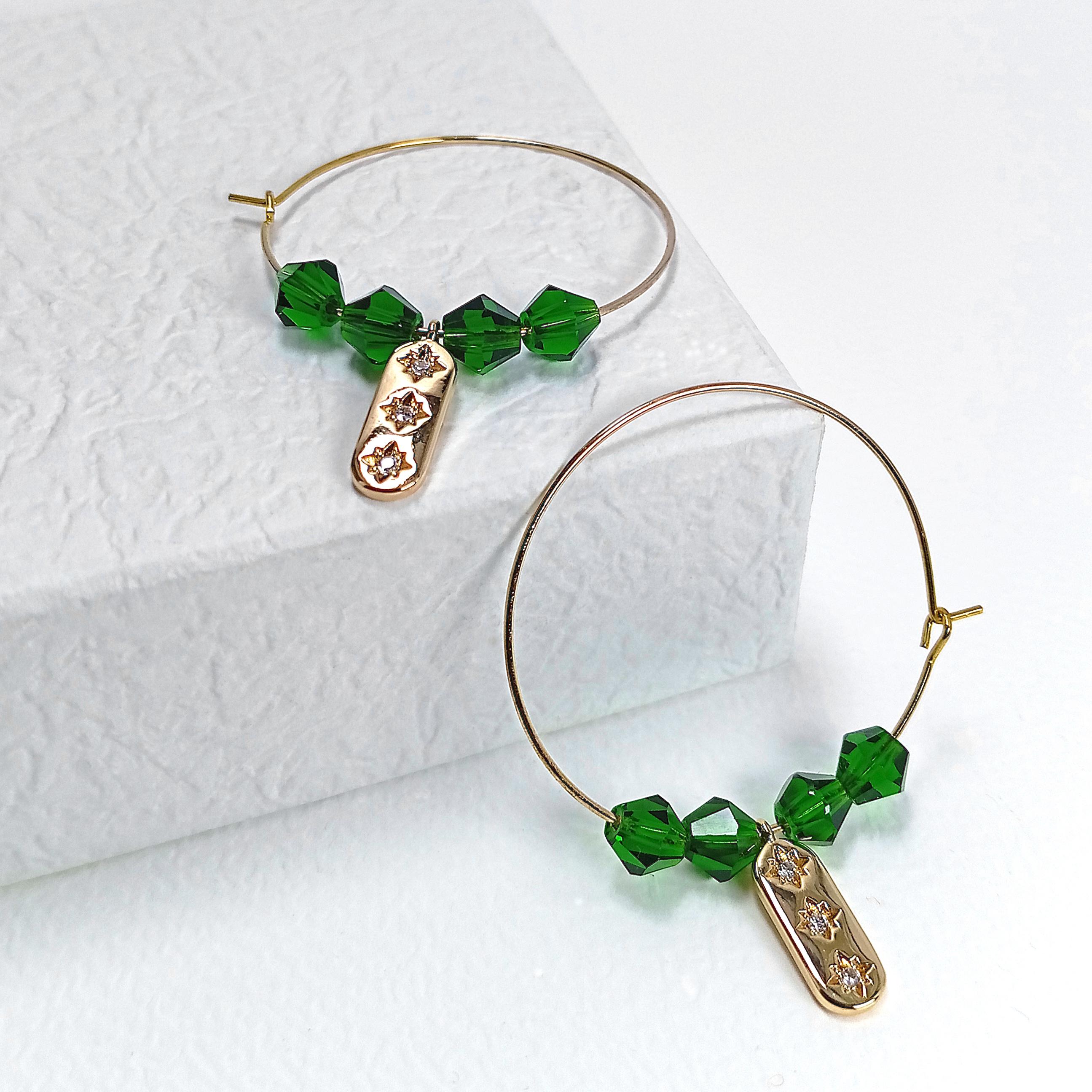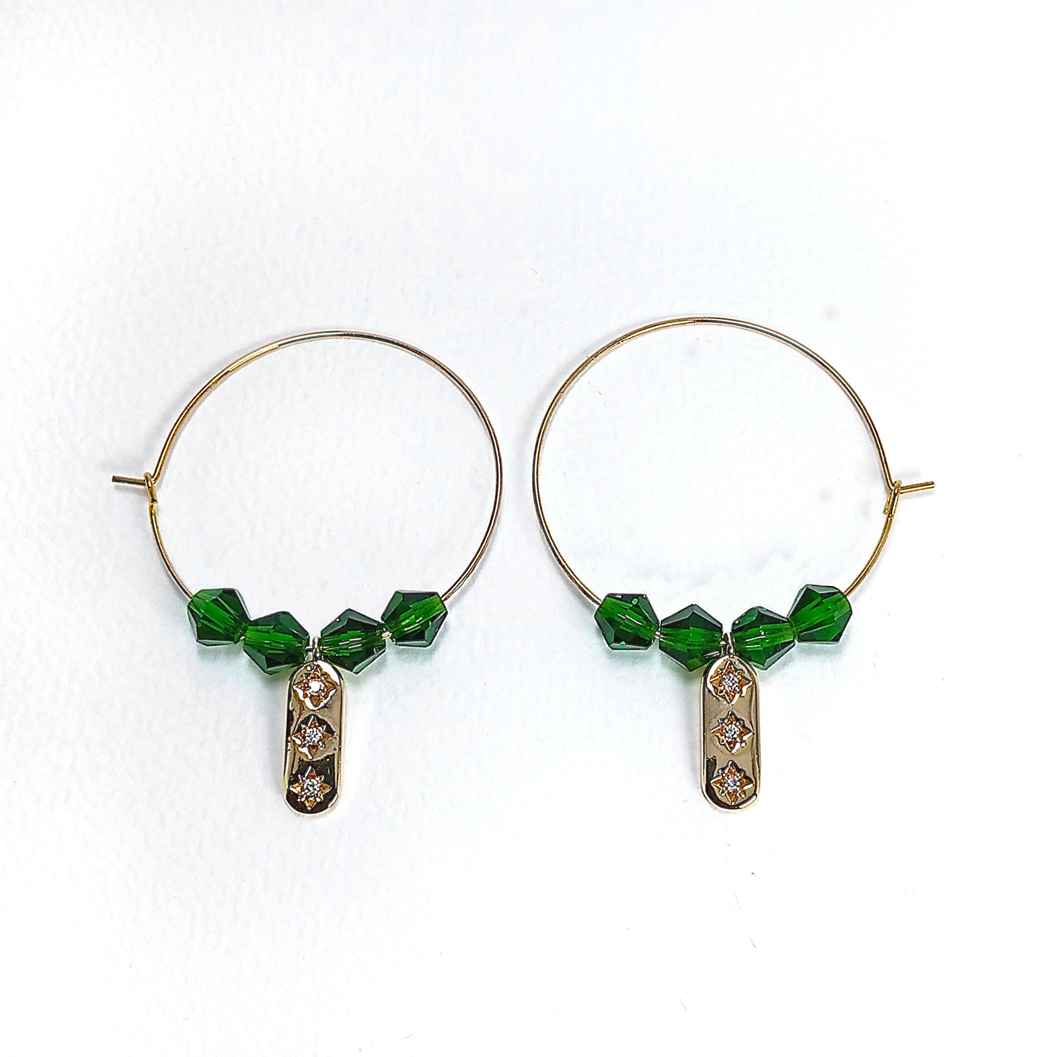 Hoop earrings created from a gold-plated brass ring, green faceted glass beads and a 24k gold-plated brass charm adorned with crystal rhinestones.