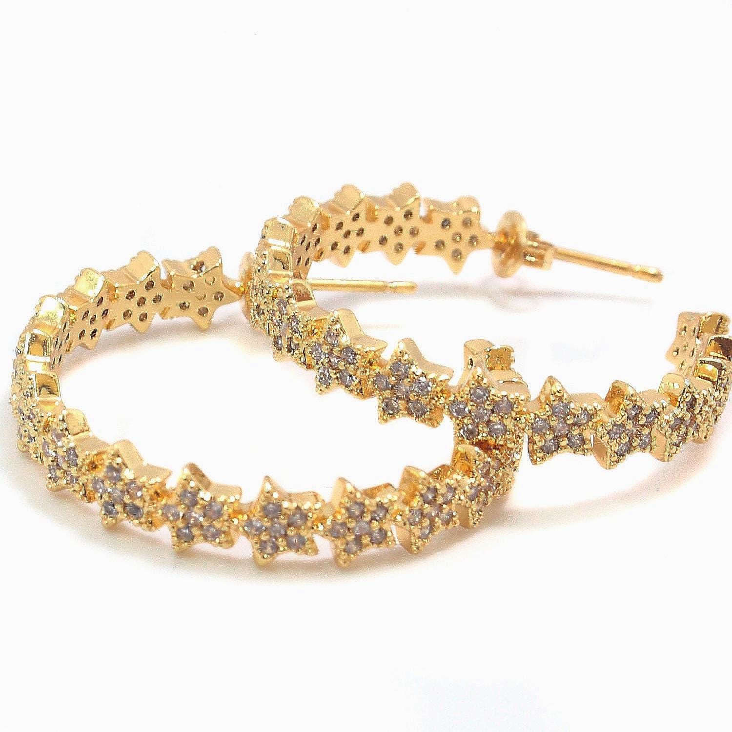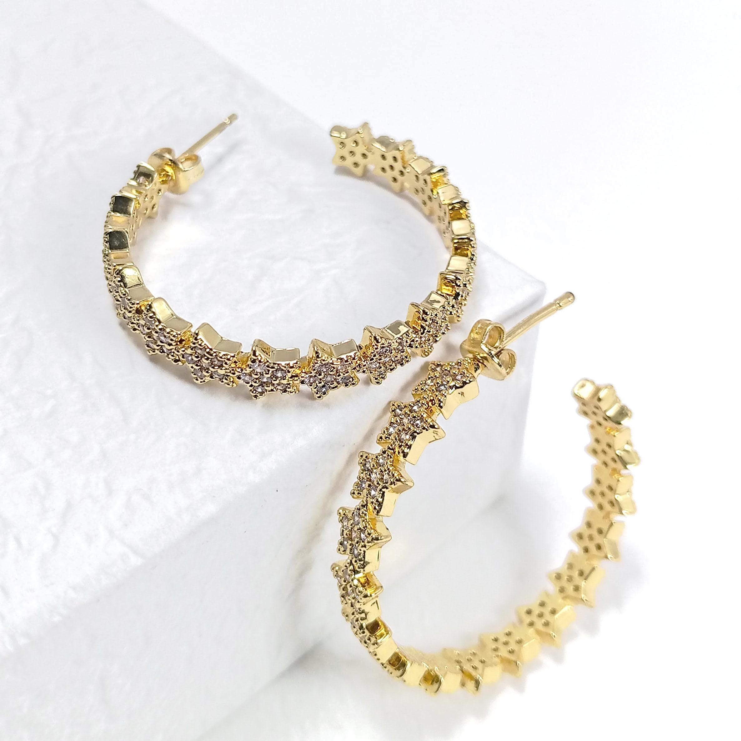 Thick oval hoop earrings in gold-plated stainless steel and rhinestones.