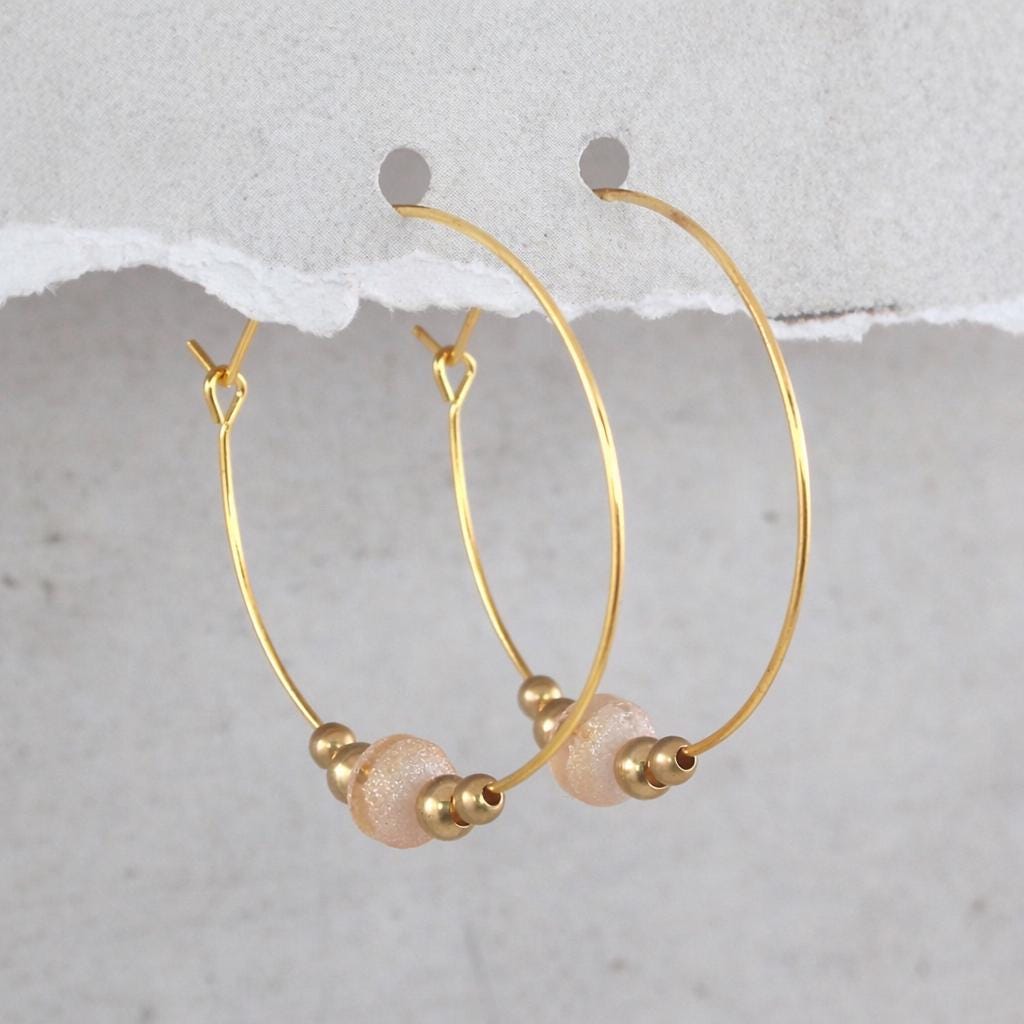 Gold-plated brass hoop earrings with frosted glass beads.