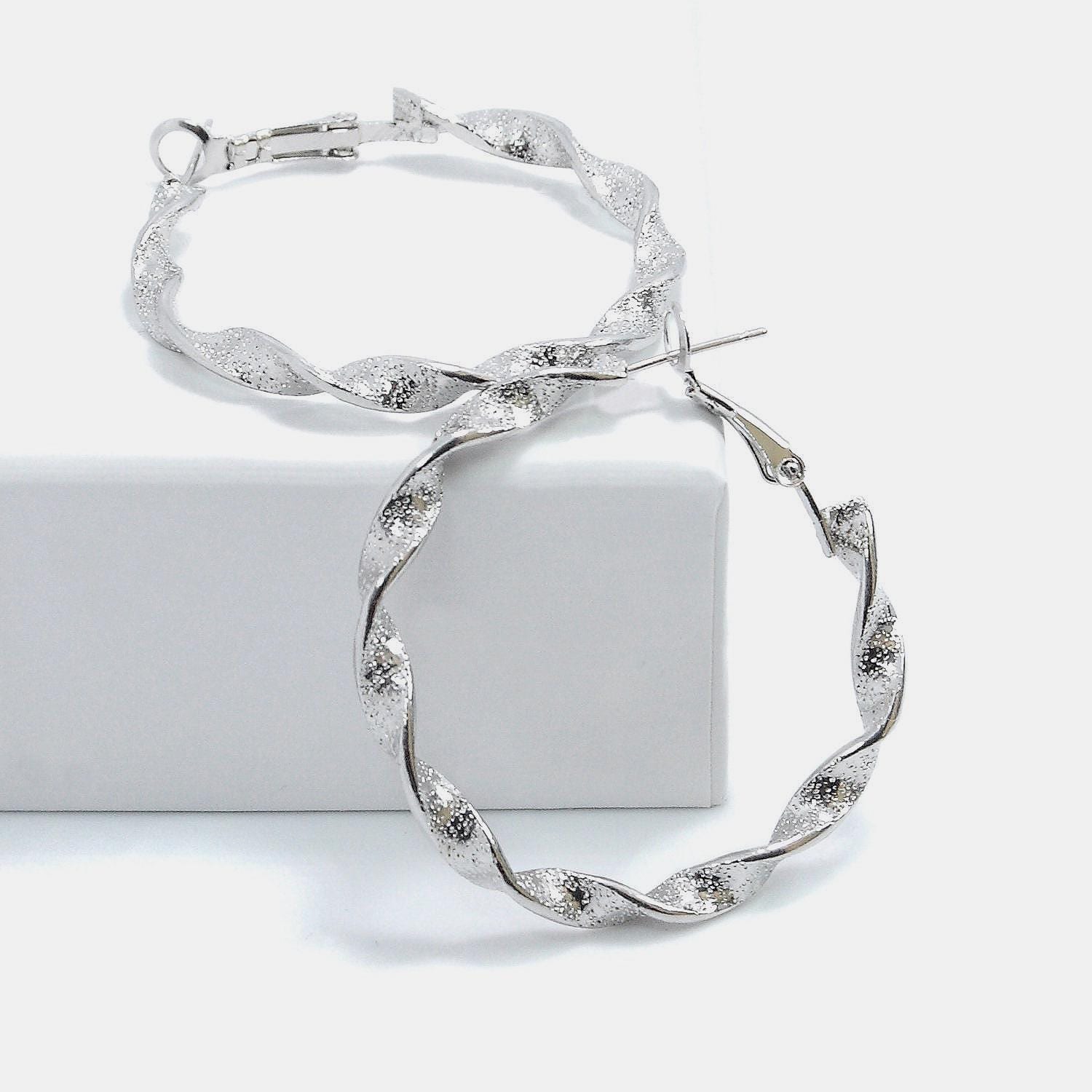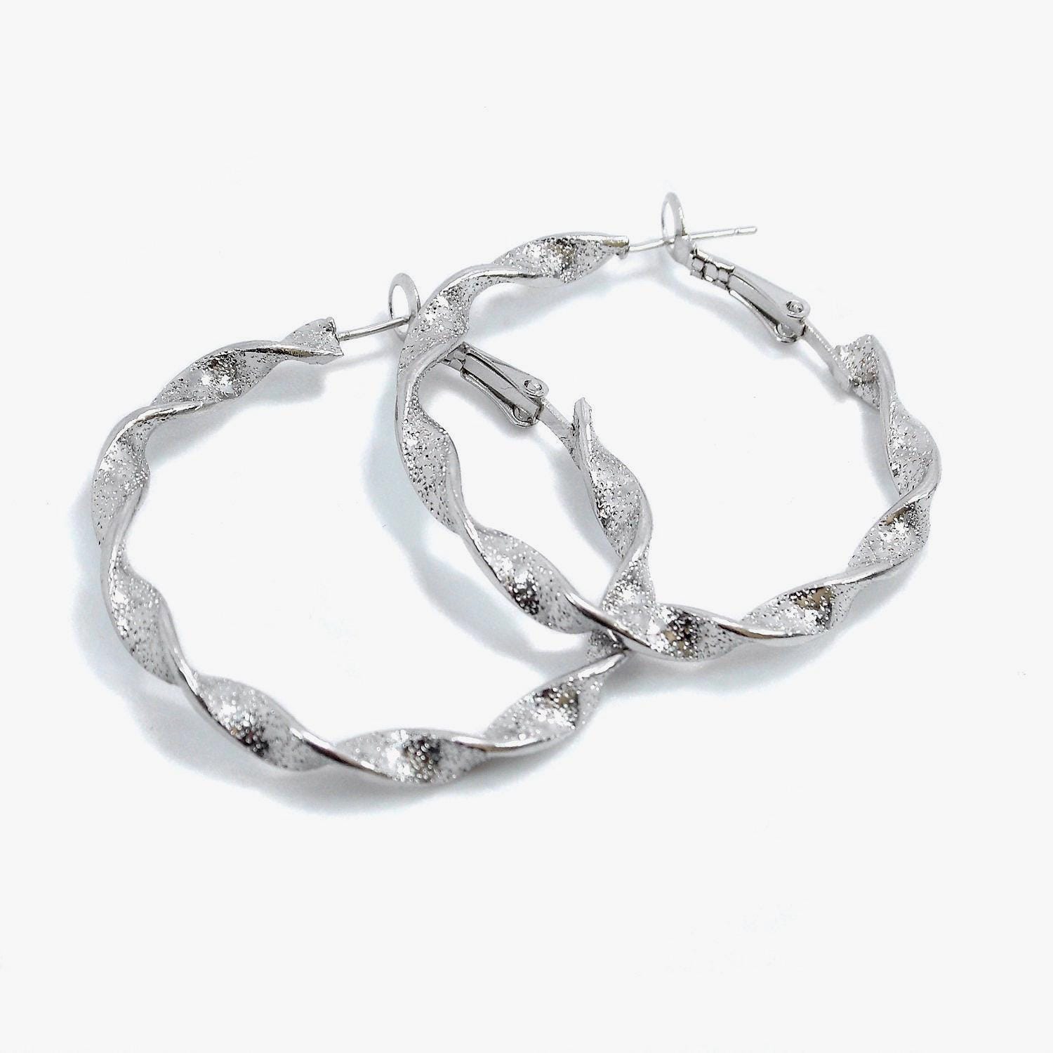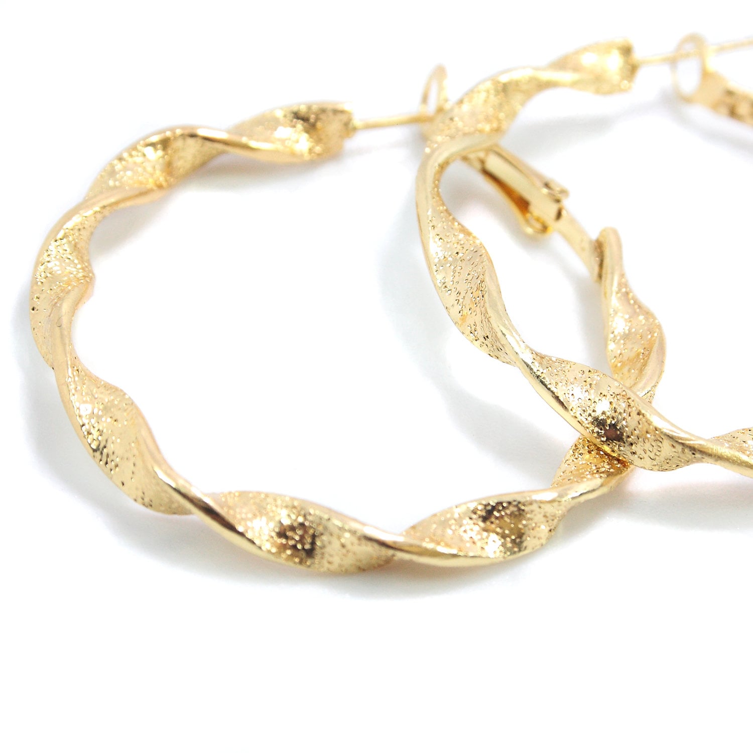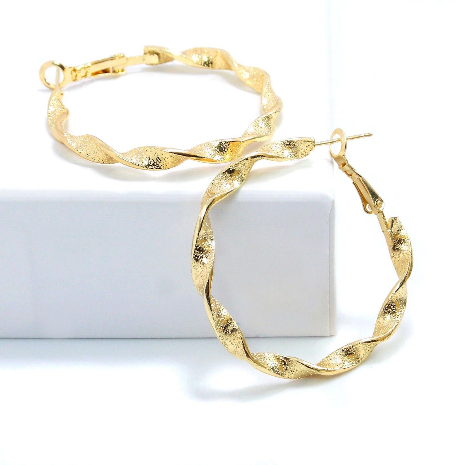 Twisted brass hoop earrings with a "sequin" effect.