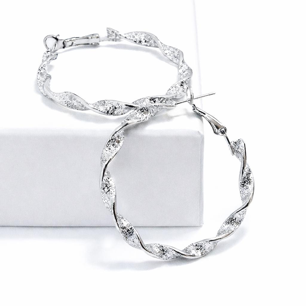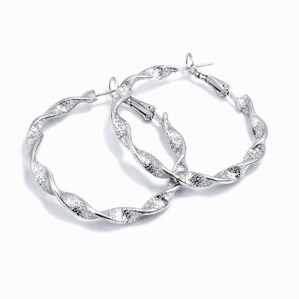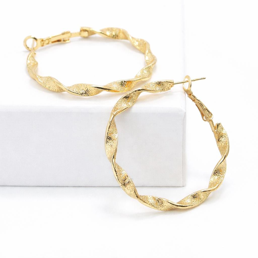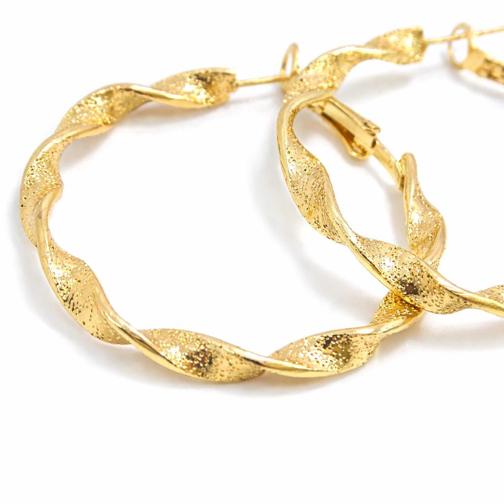 Twisted brass hoop earrings with a "sequin" effect.