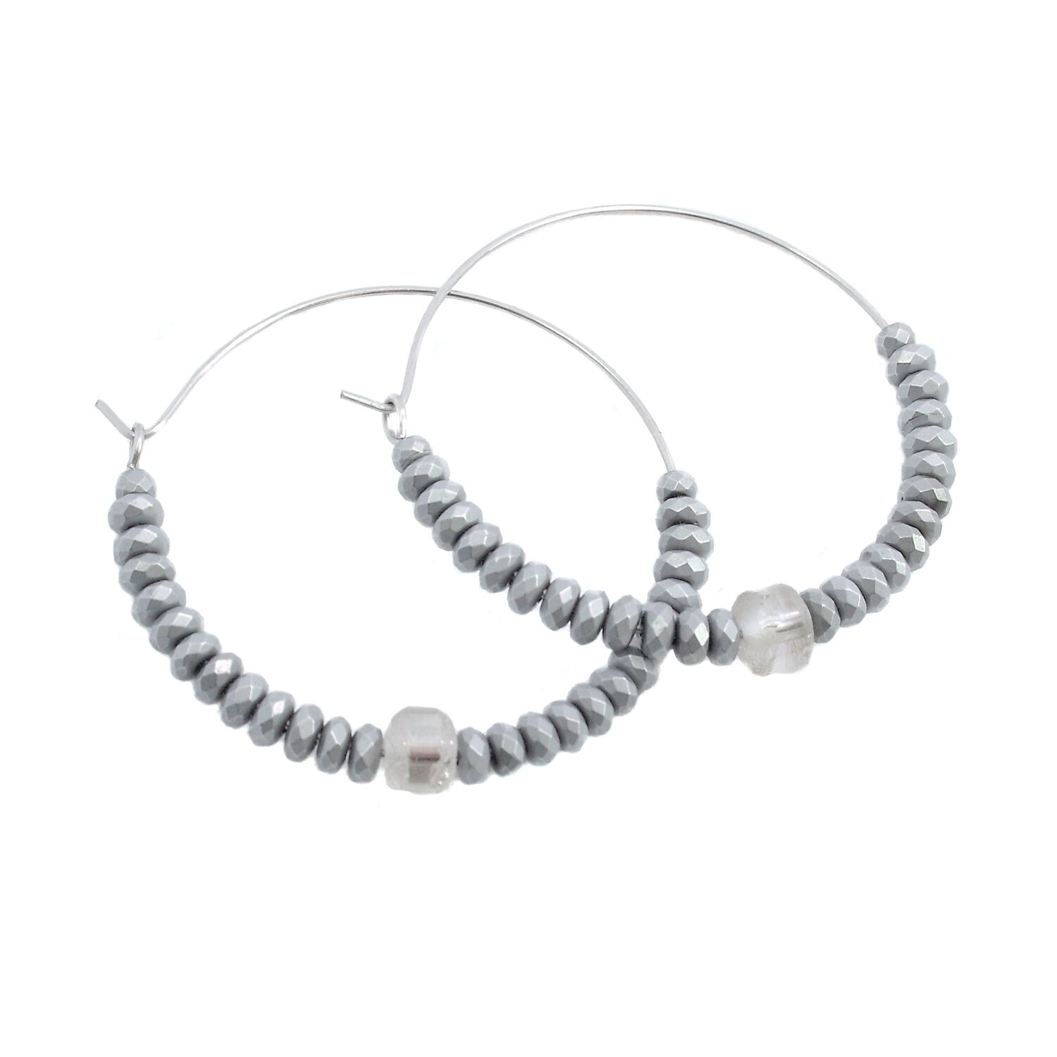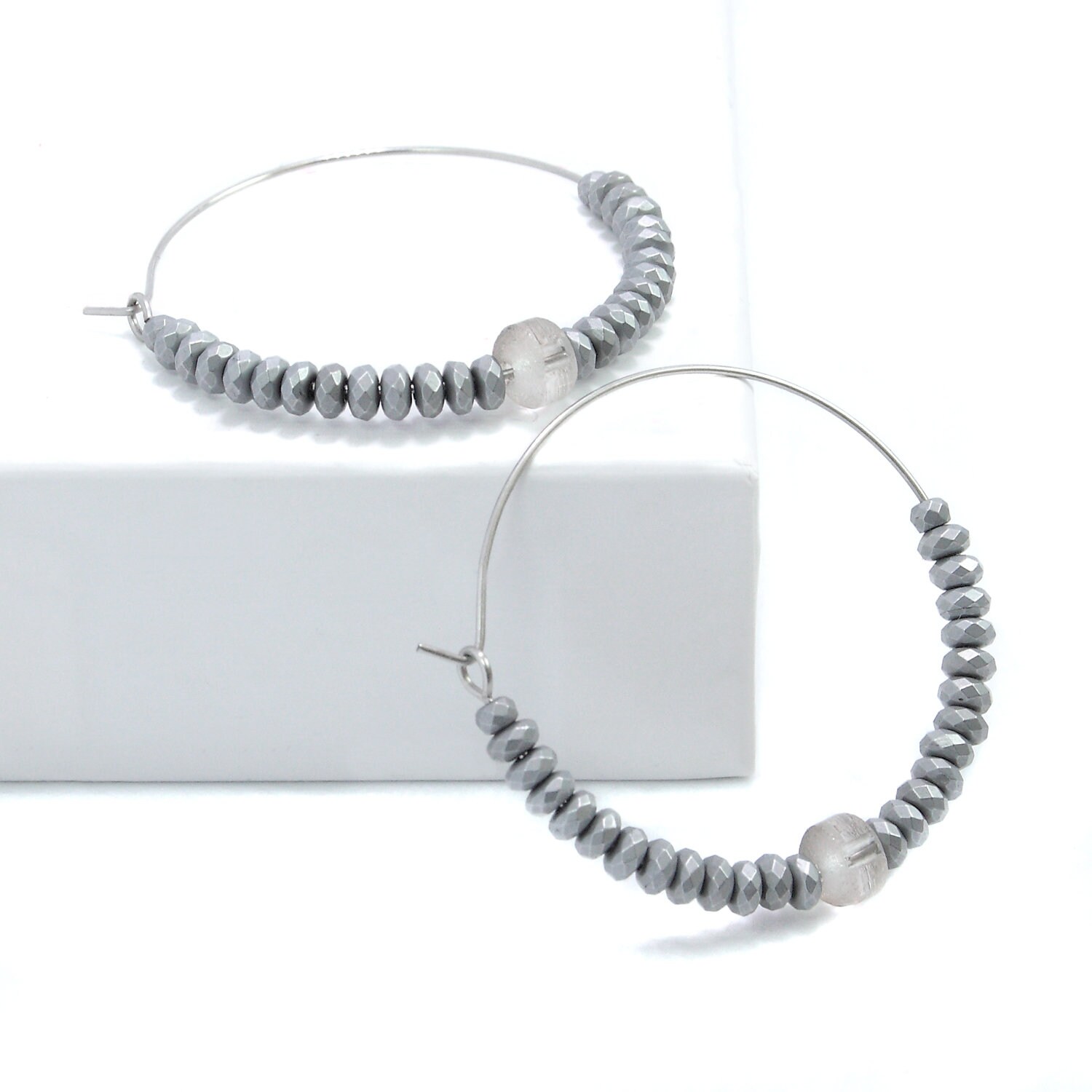 Delicate stainless steel hoop earrings with anthracite glass beads.