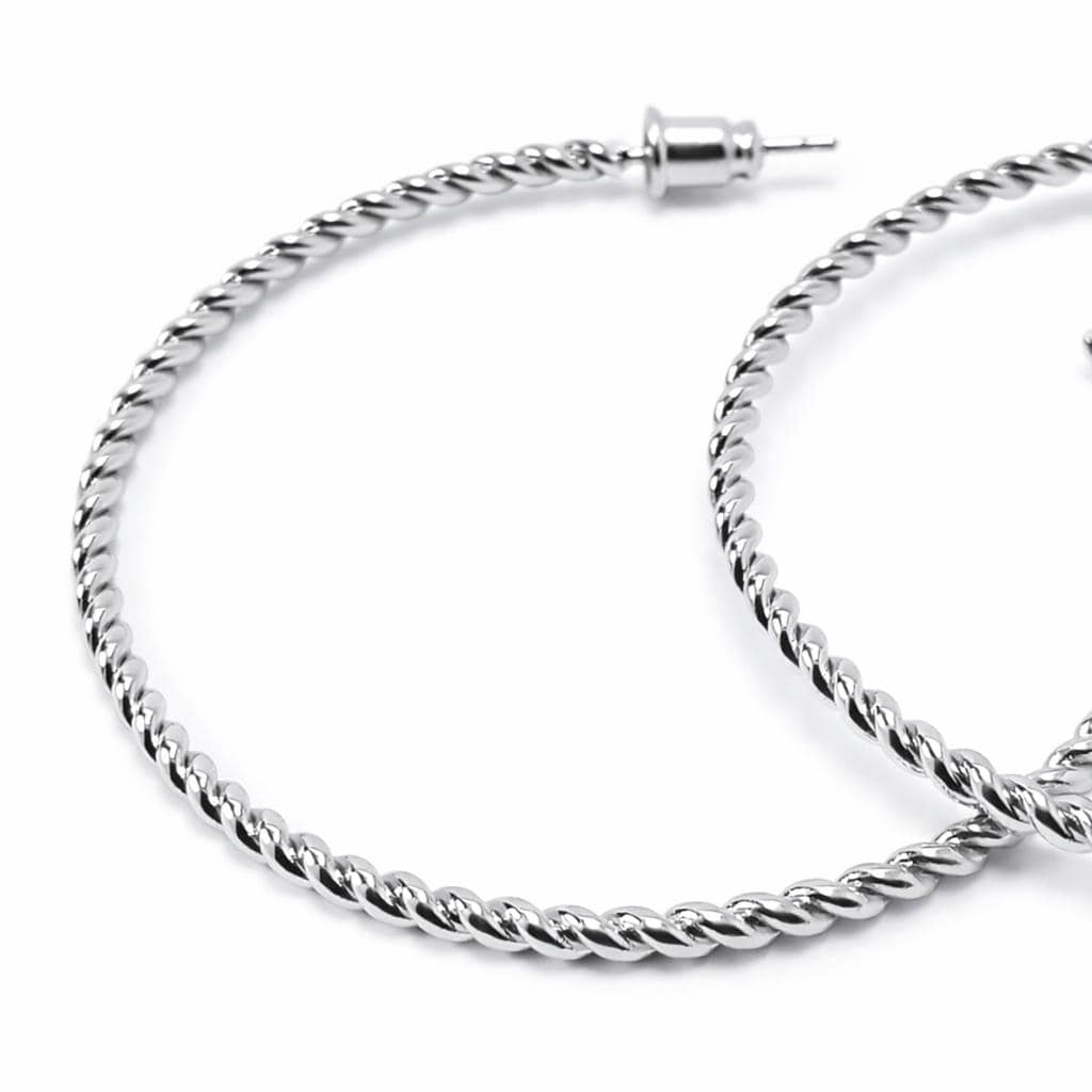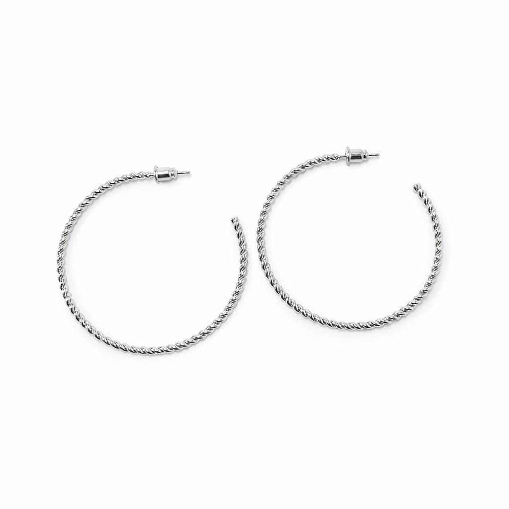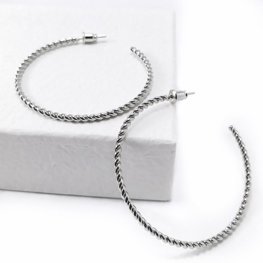 Thin open twisted hoop earrings in silver stainless steel.