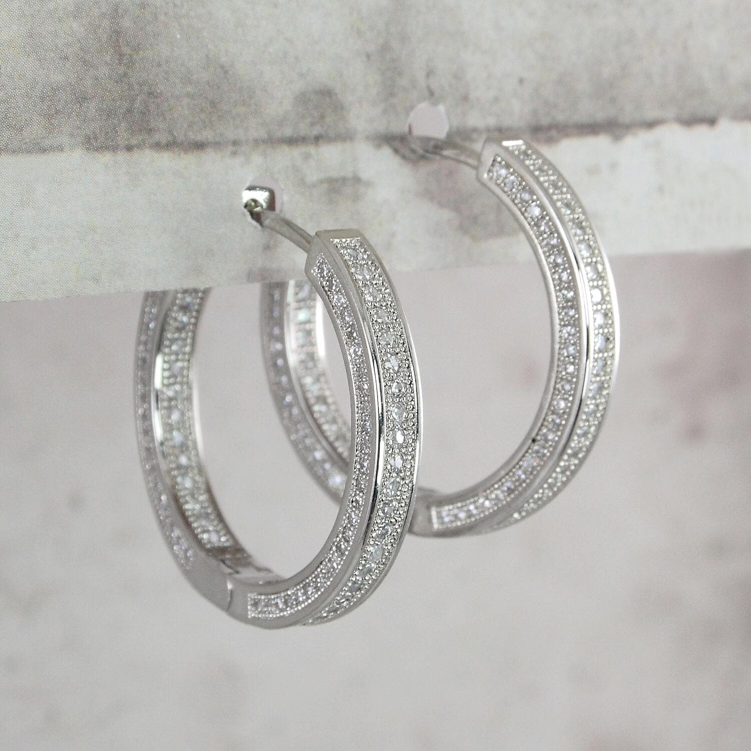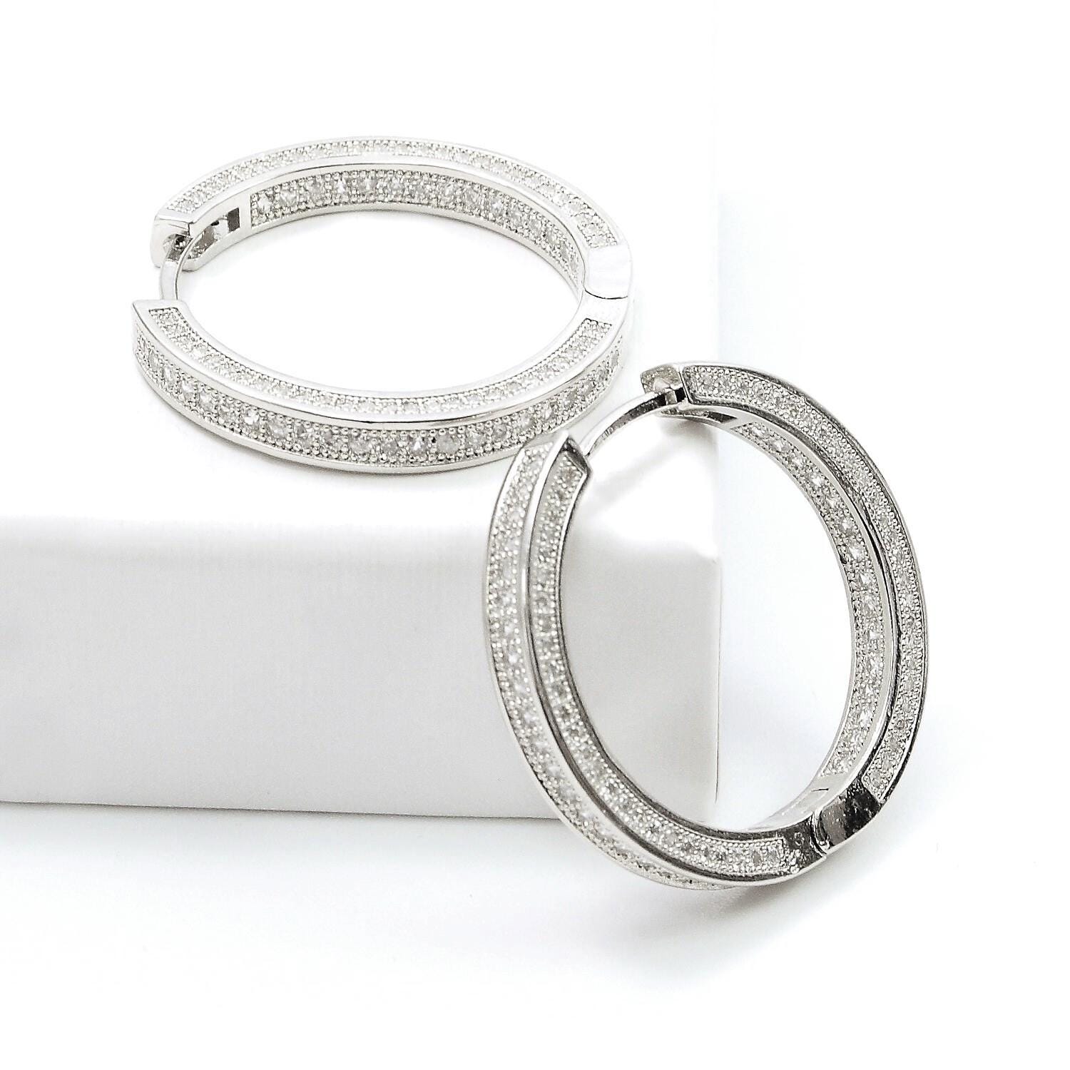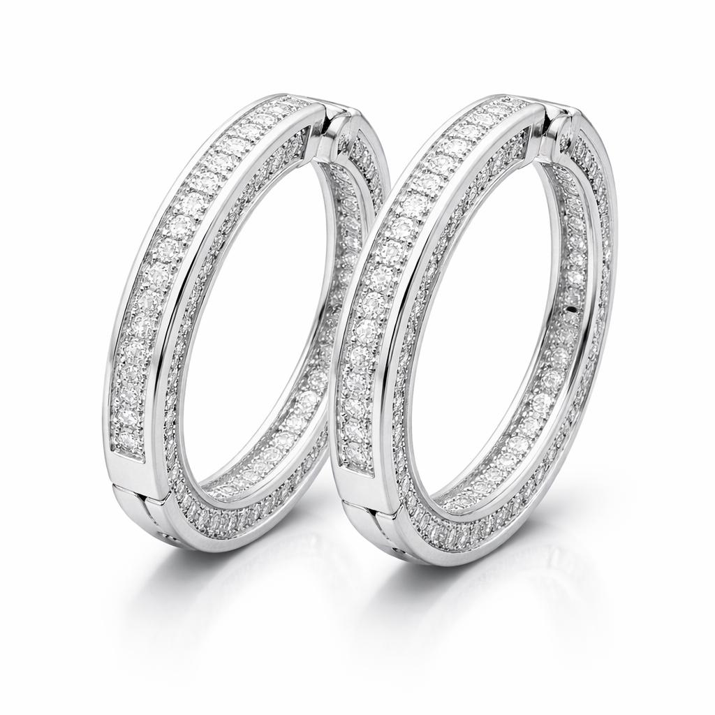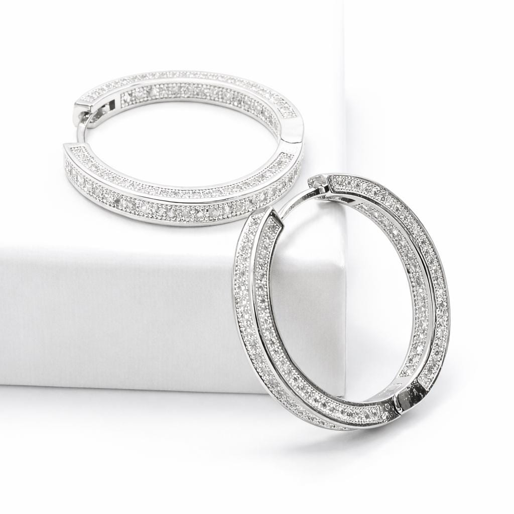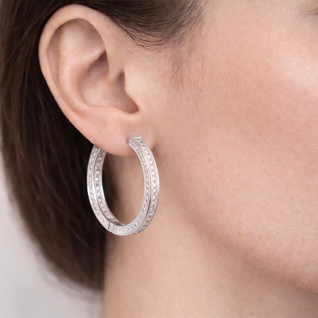 Thick hoop earrings in "platinum" colored steel and zircon.