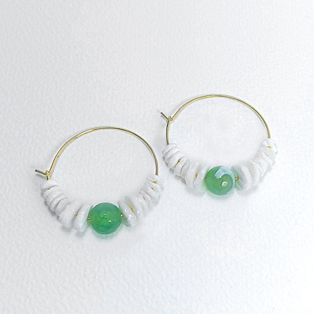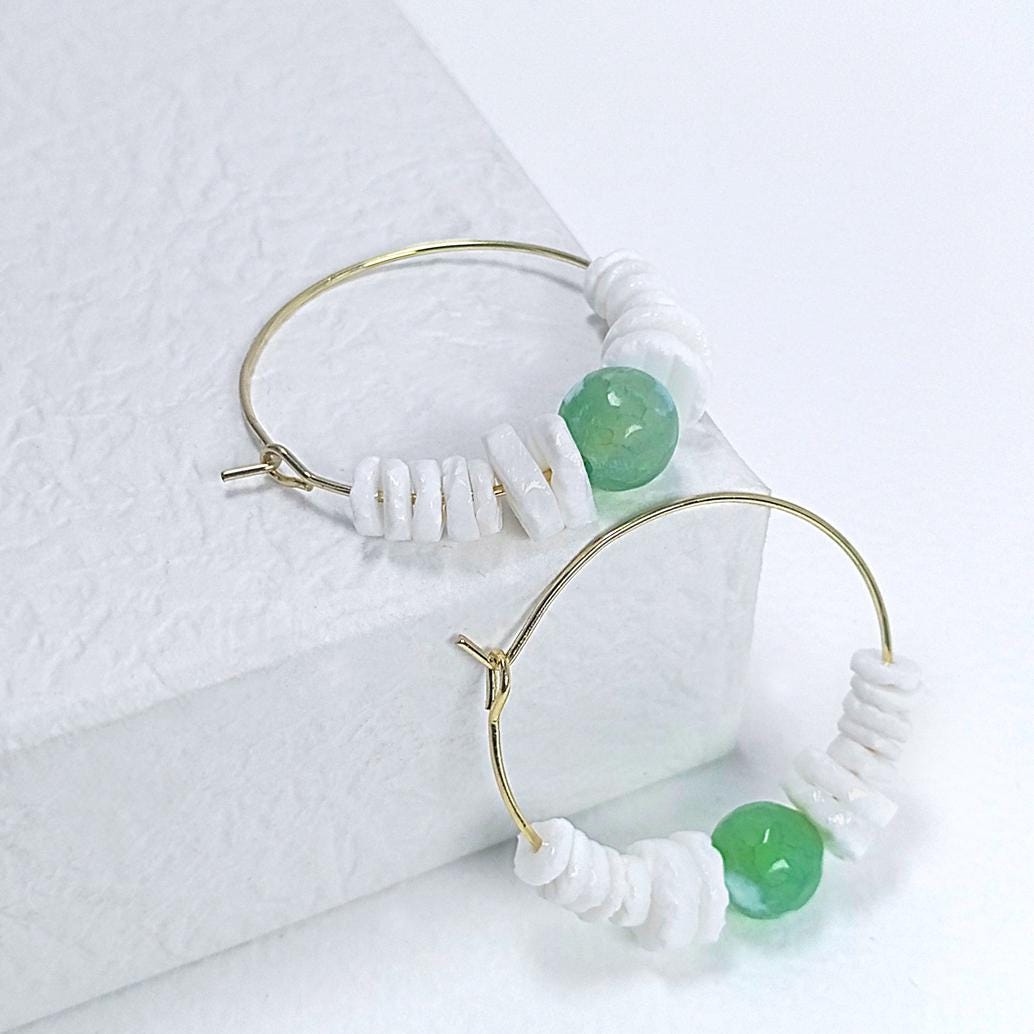 Hoop earrings in 24K gold-plated brass, adorned with white shell rondelles and a green agate bead.