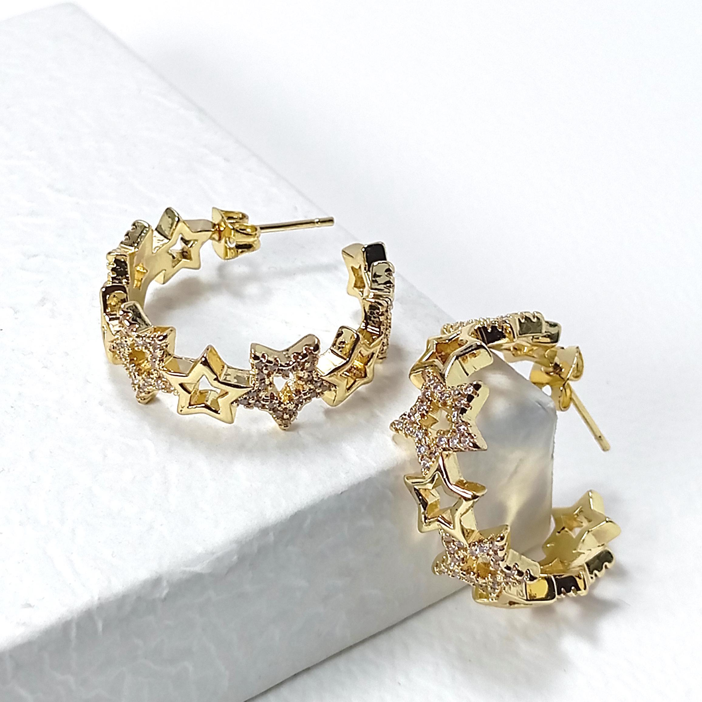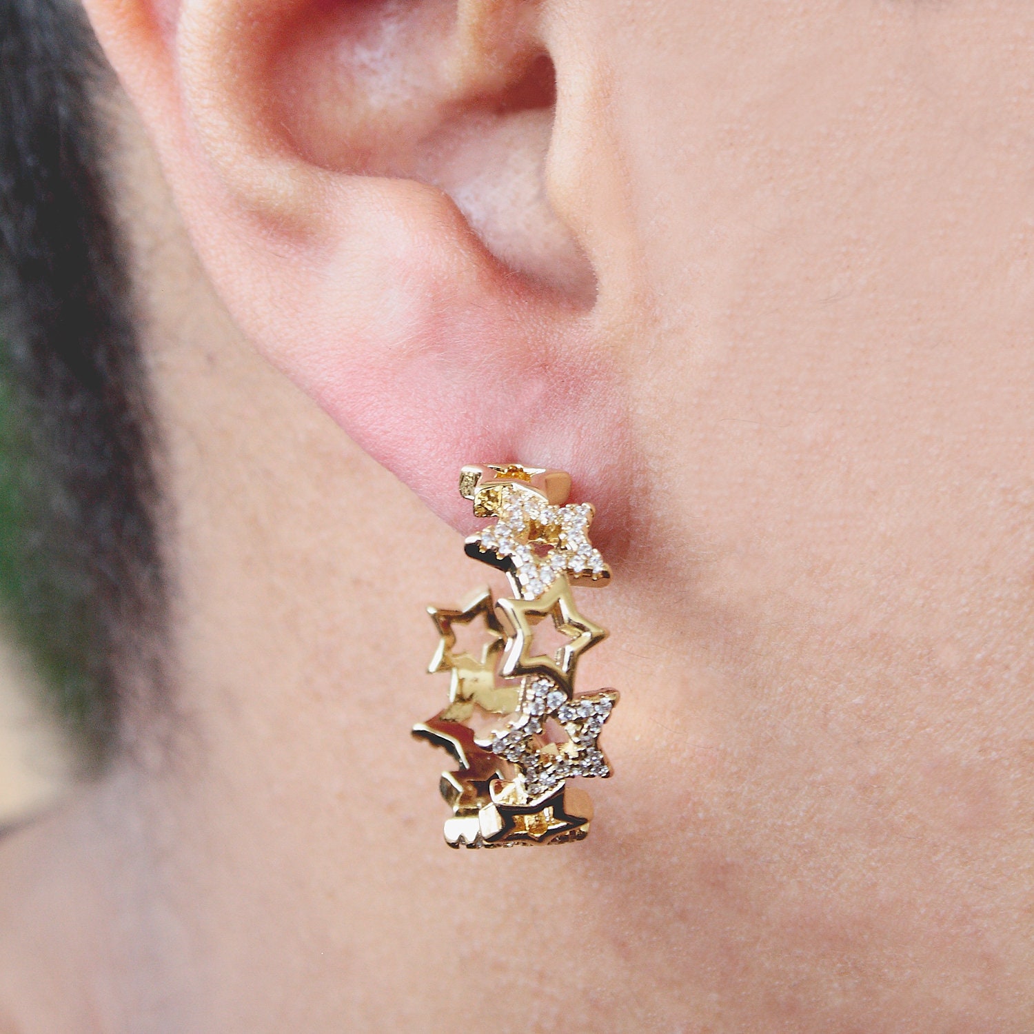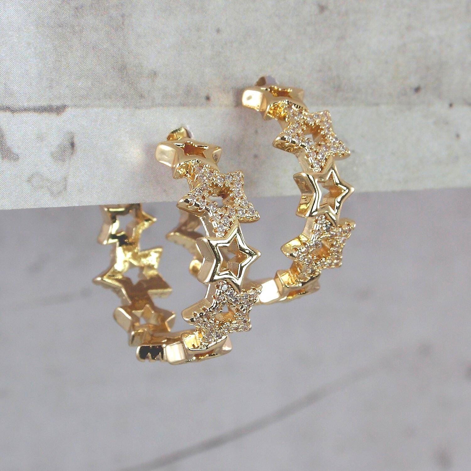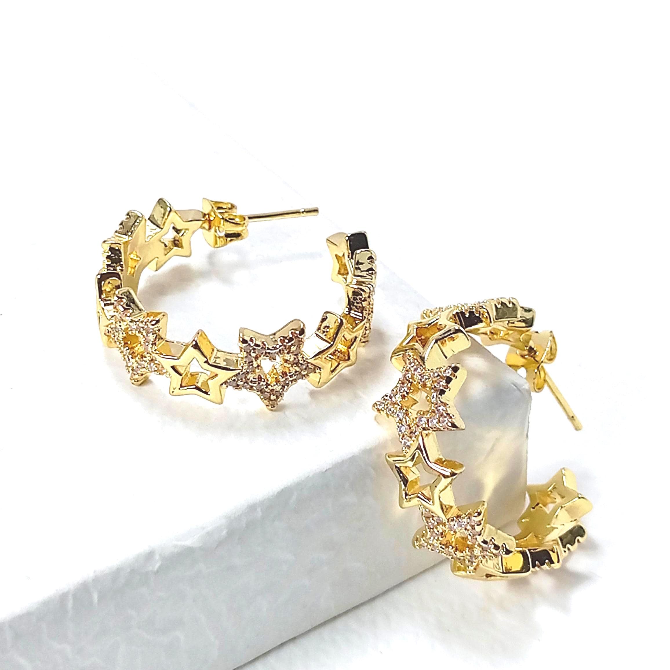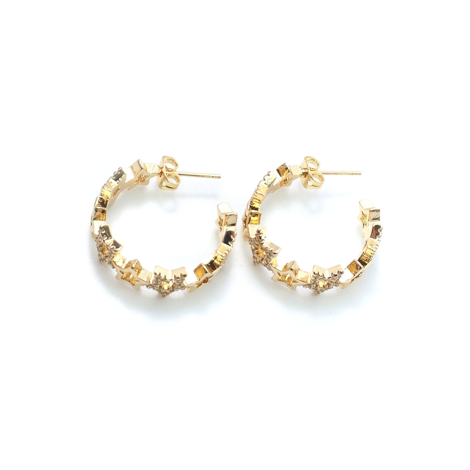 Gold-plated stainless steel hoop earrings with rhinestone "stars".