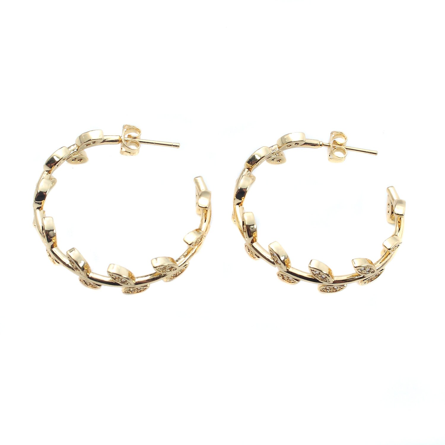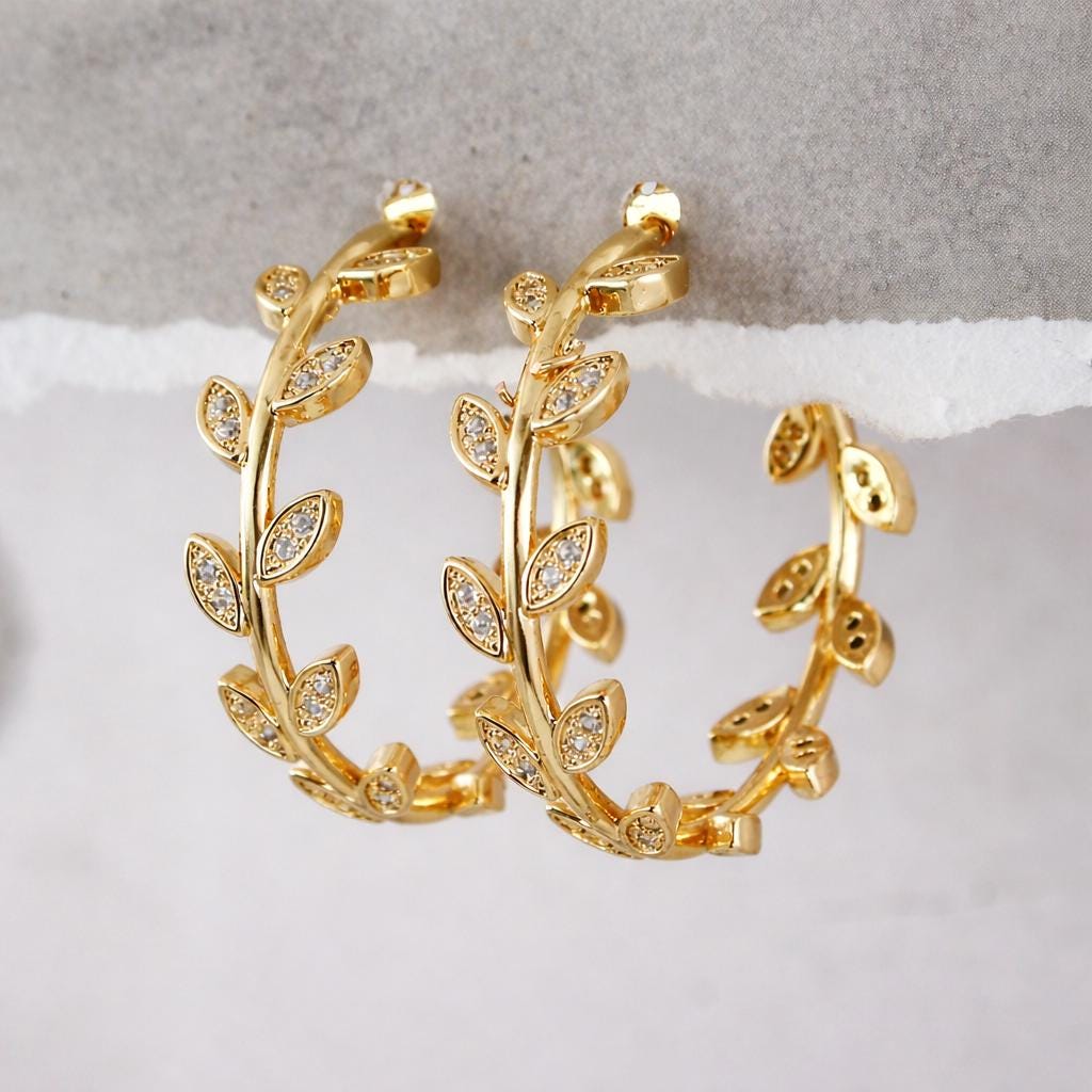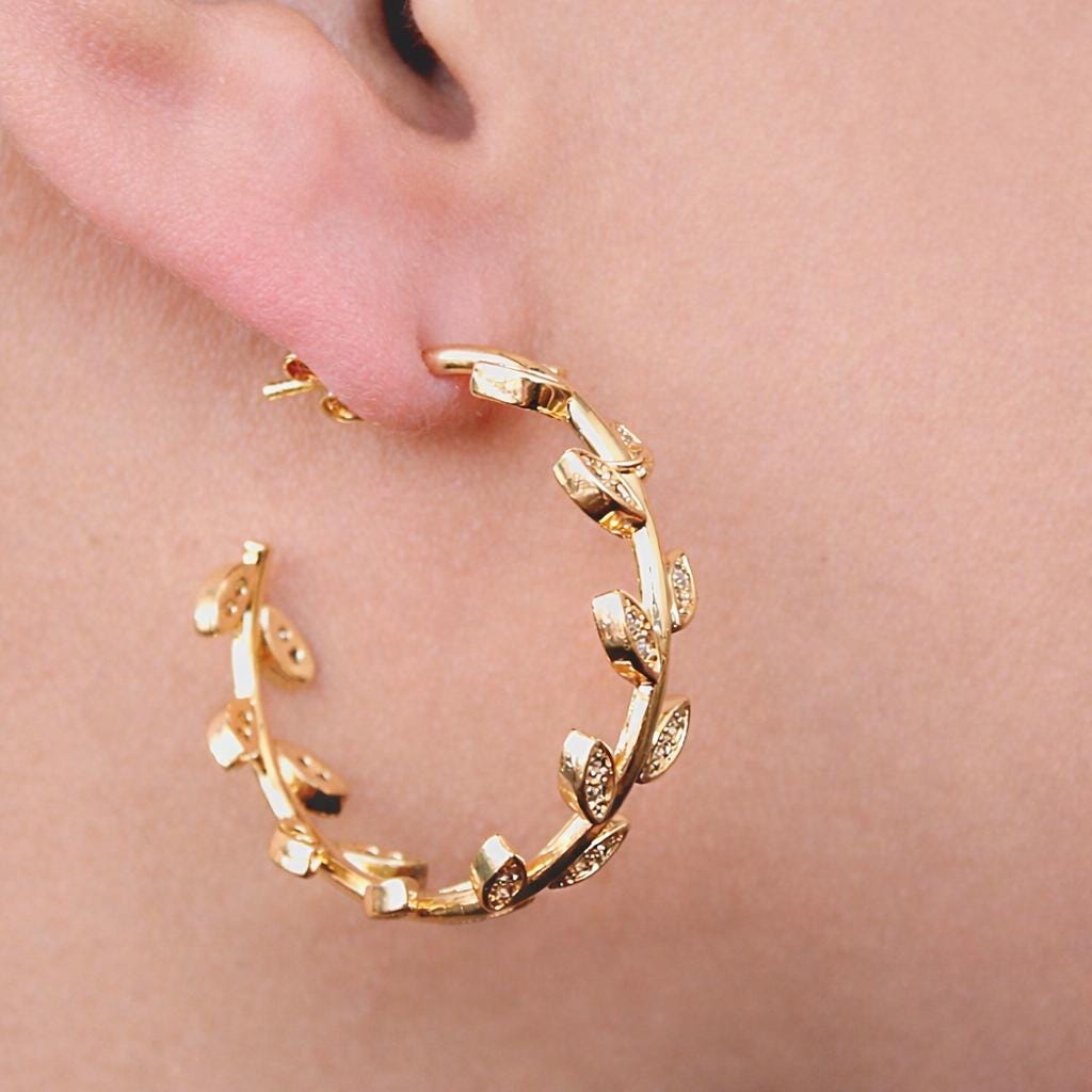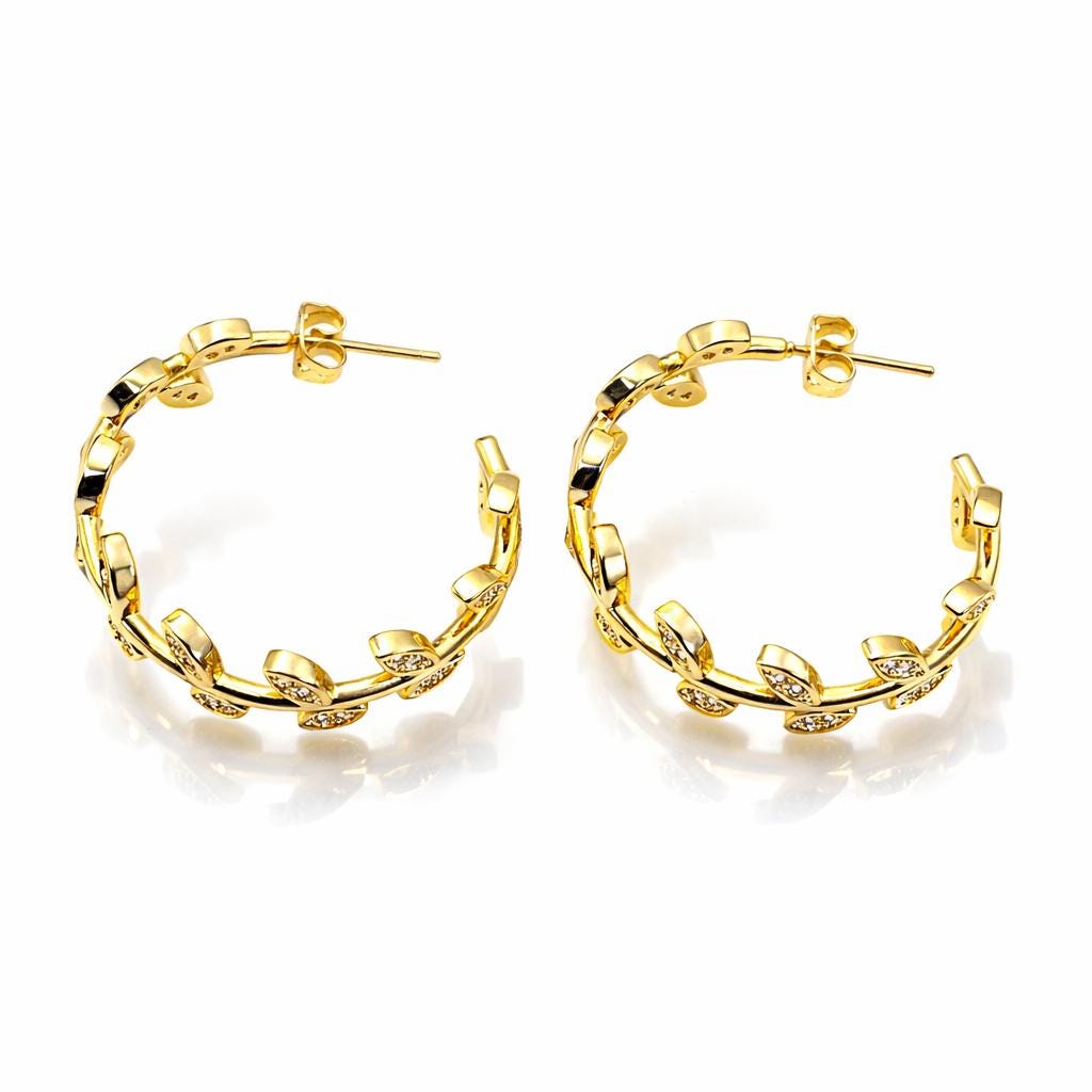 Open "leaf" hoop earrings in gold-plated stainless steel and rhinestones.
