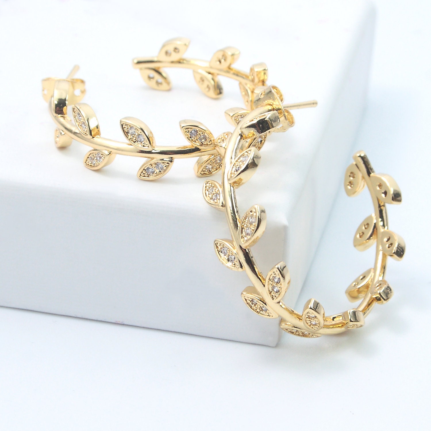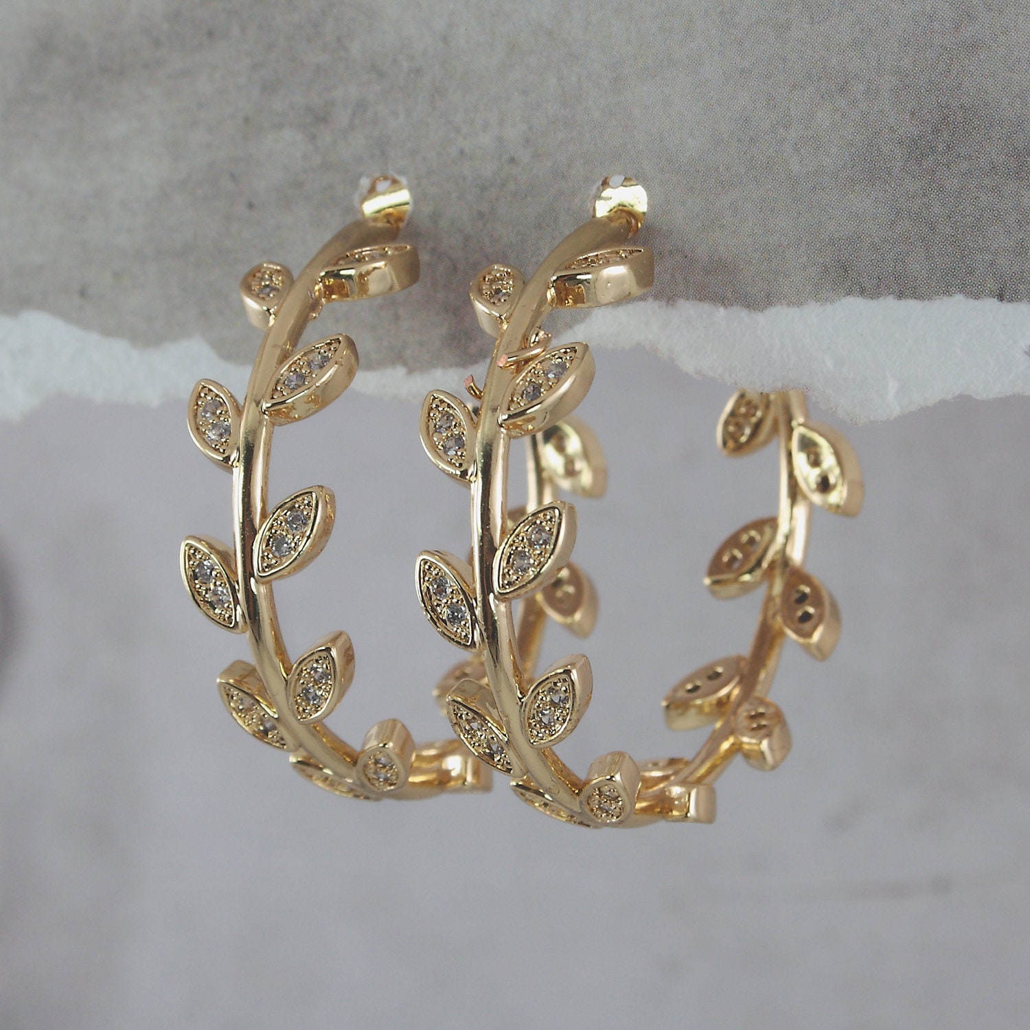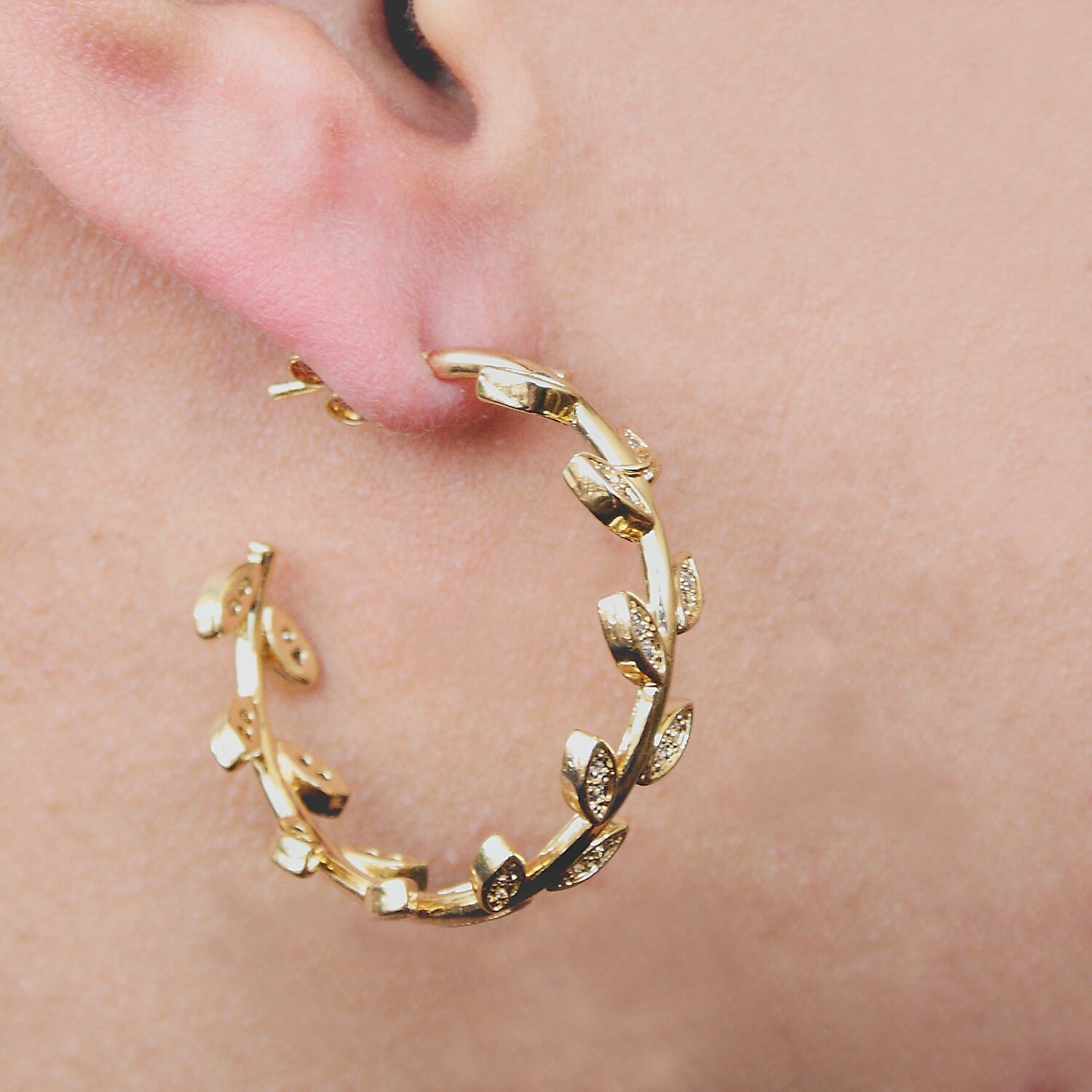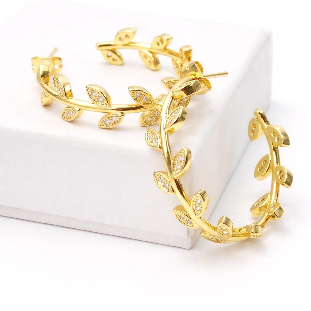 Open "leaf" hoop earrings in gold-plated stainless steel and rhinestones.