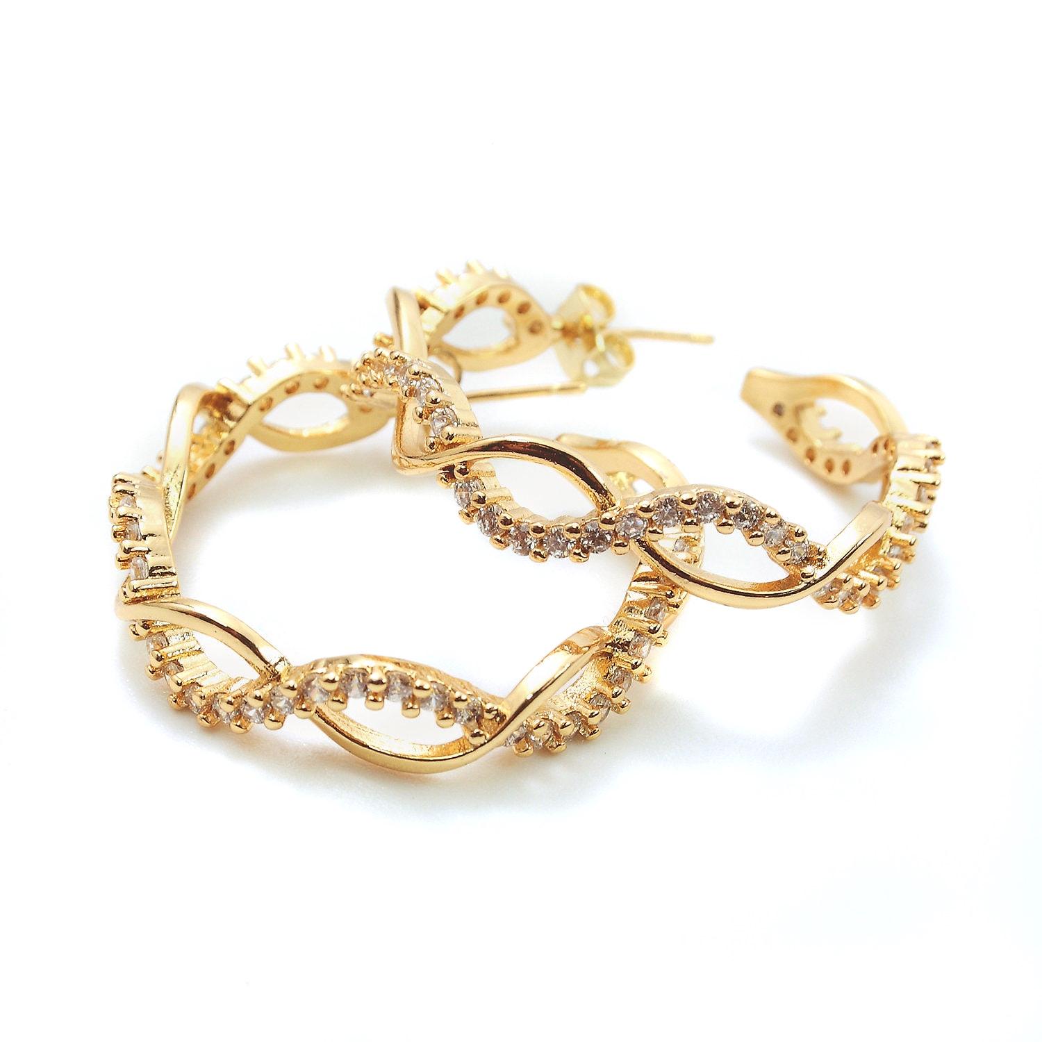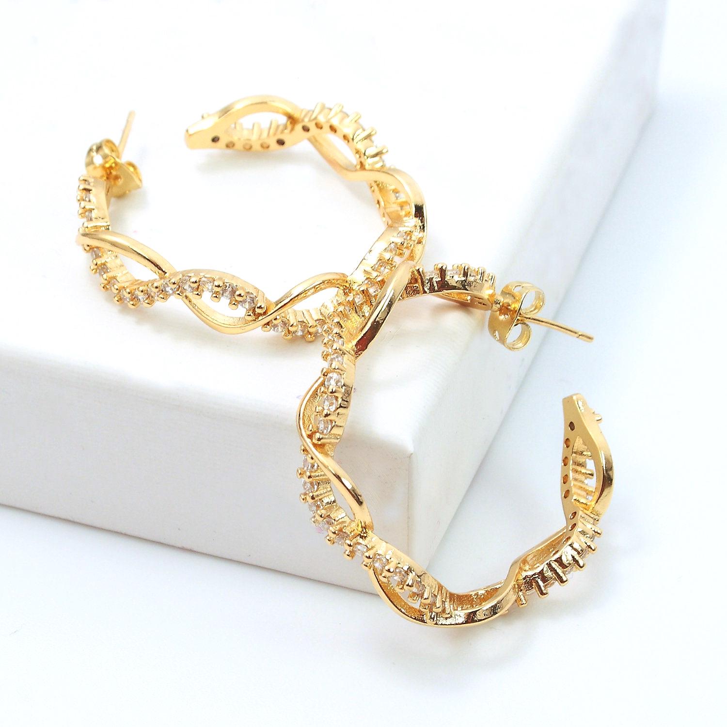 Elongated hoop earrings in gold-plated brass and rhinestones.