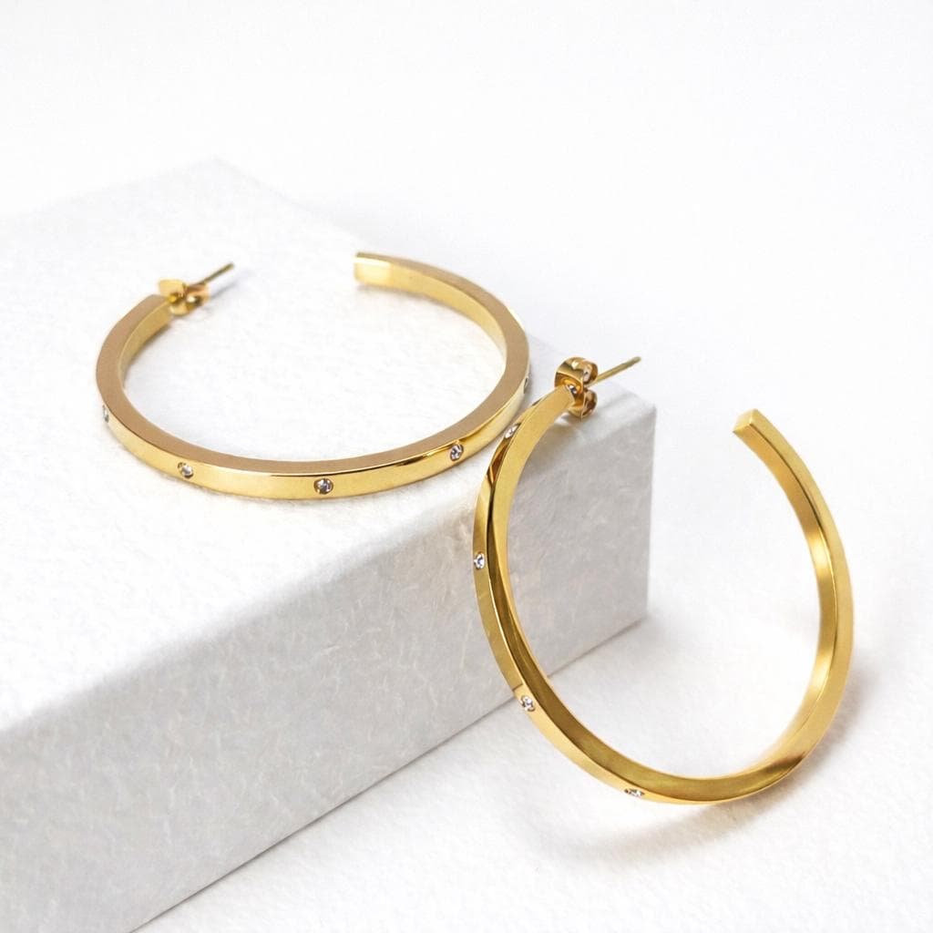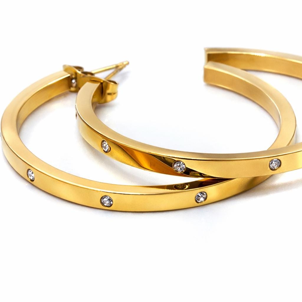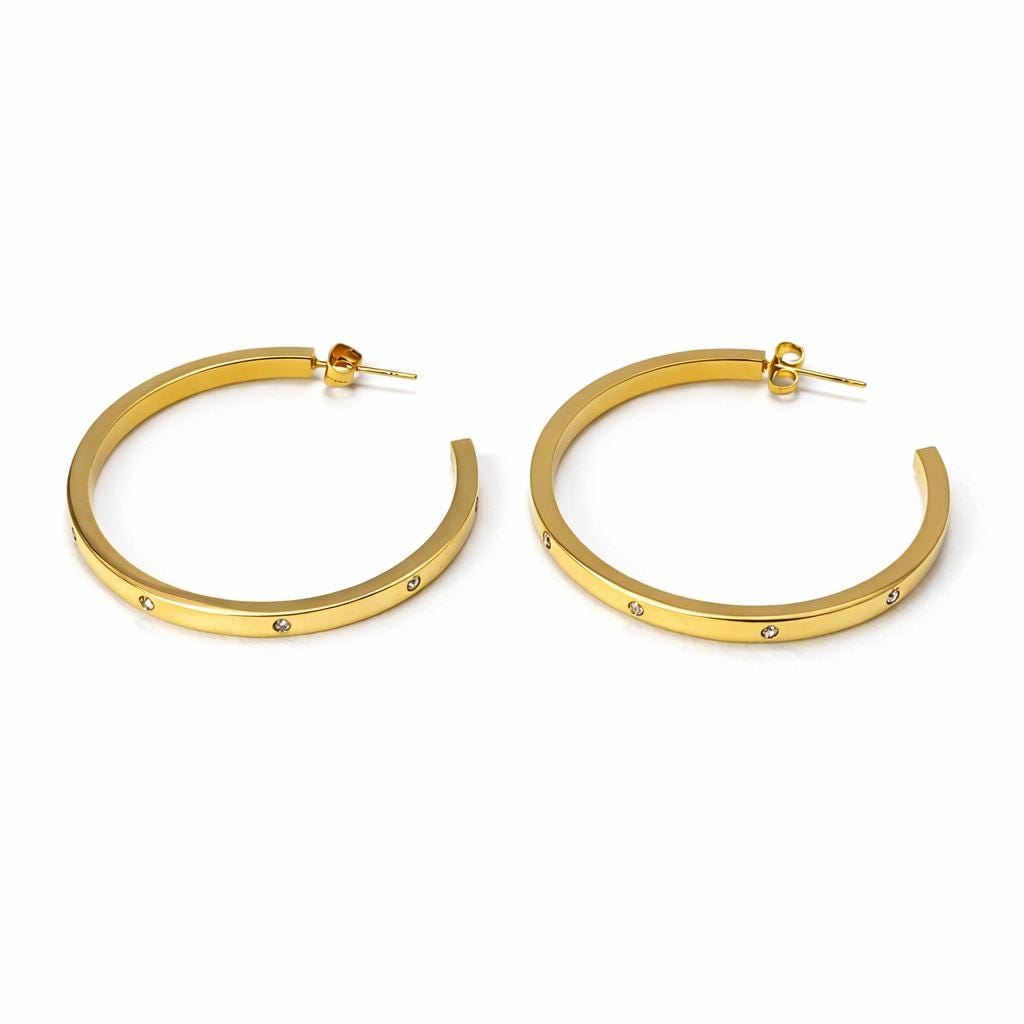Open hoop earrings in gold-plated stainless steel and zircon.