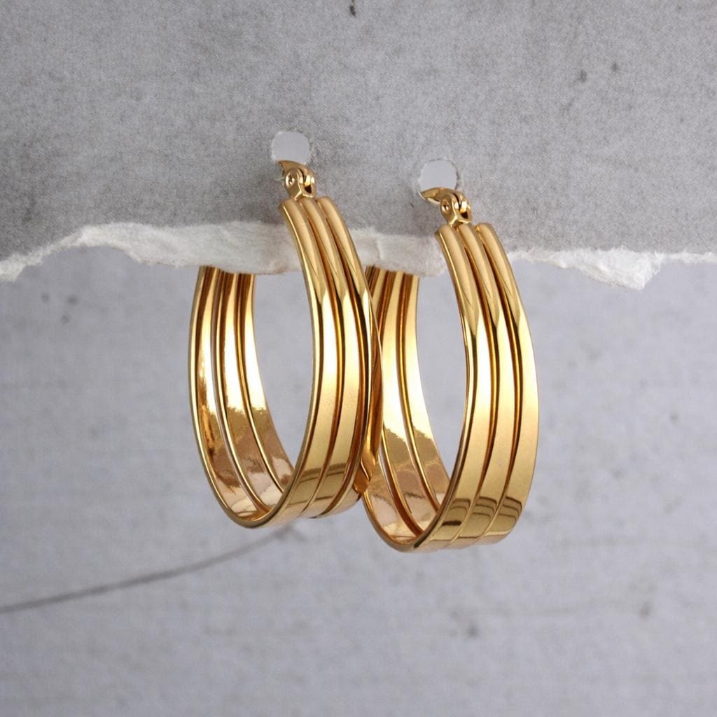 Boucles d'oreilles créoles ovales triple anneaux en acier inoxydable doré.