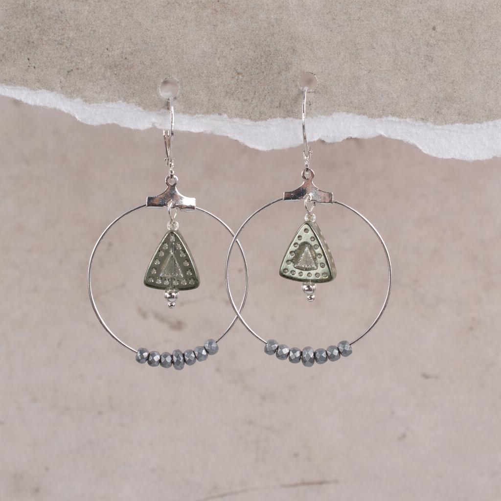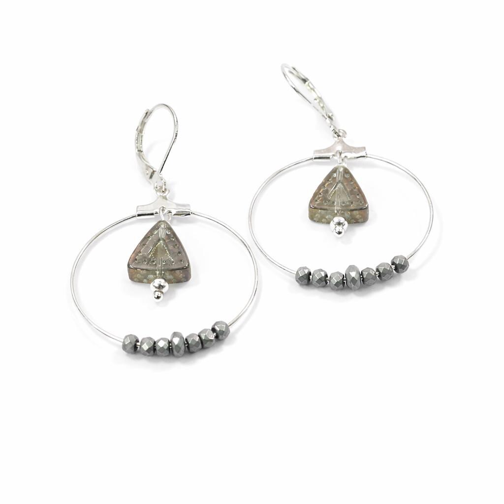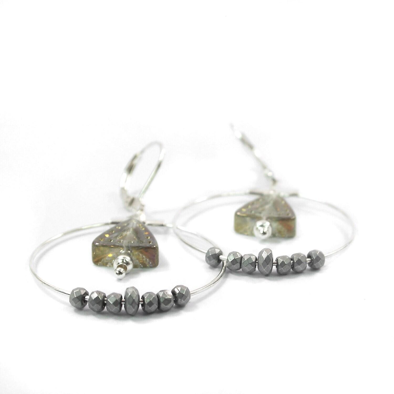 Boucles d'oreilles créoles fines en laiton argenté garni d'une perle en verre de bohème Tchèque et de mini perles en verre facetté gris métalisé.