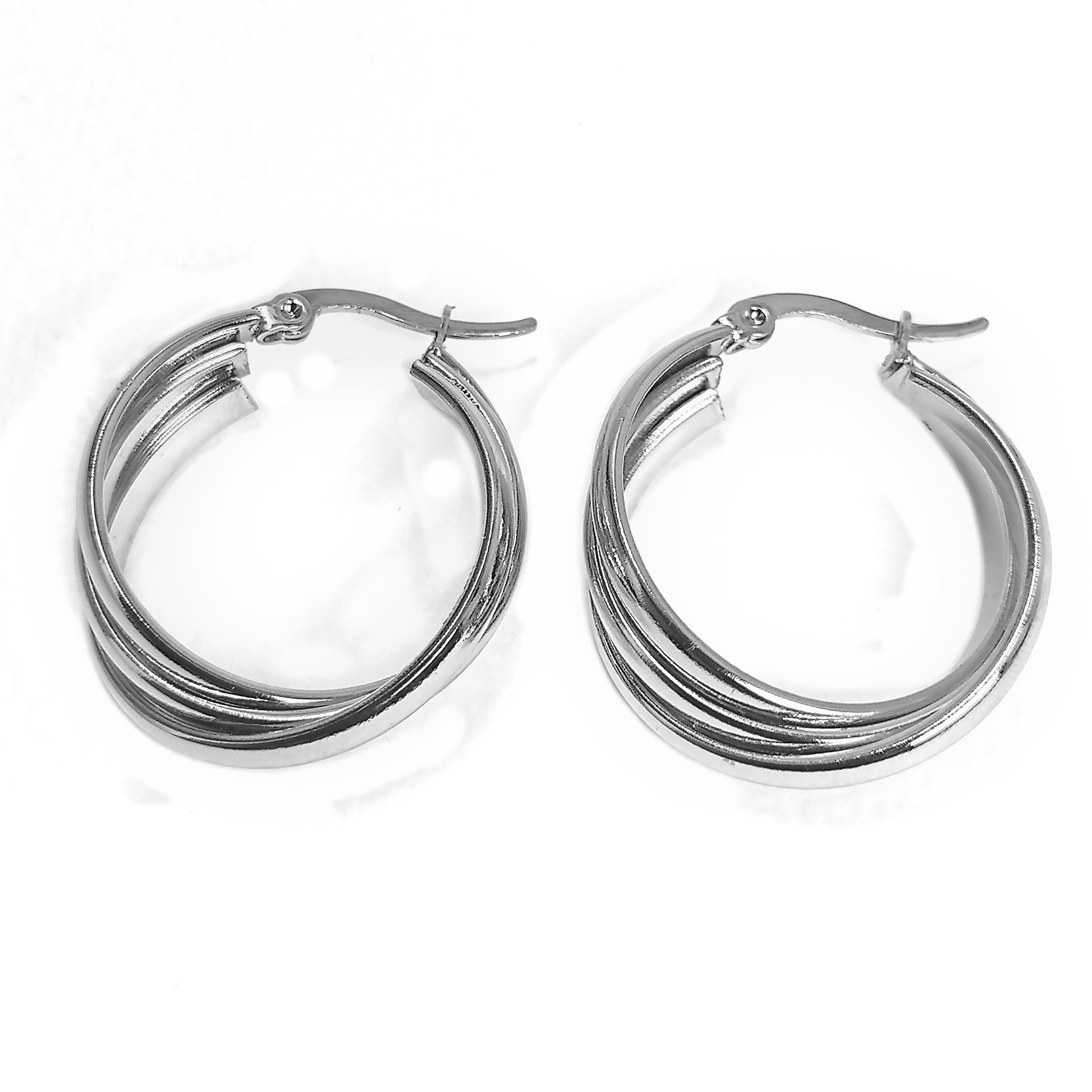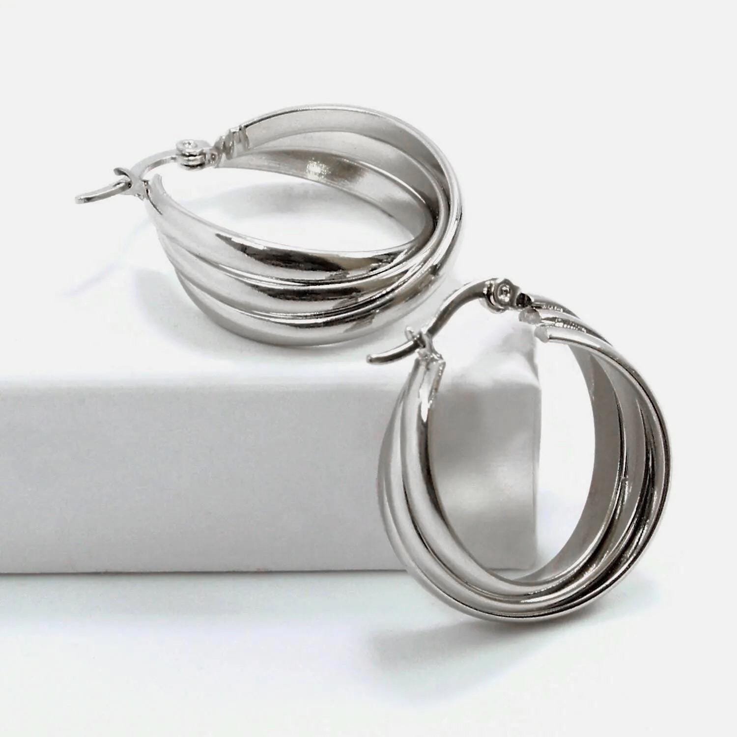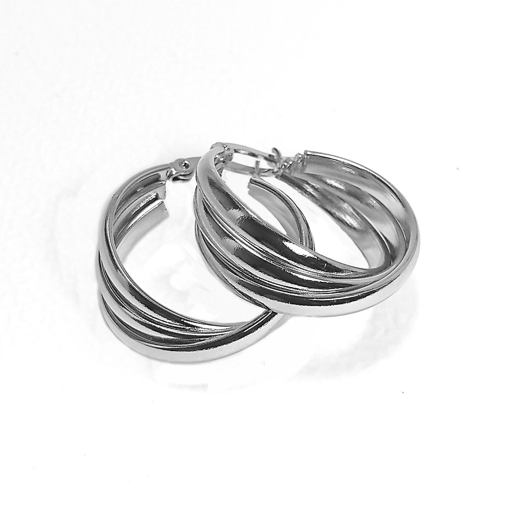 Small three-ring hoop earrings in silver-plated stainless steel.