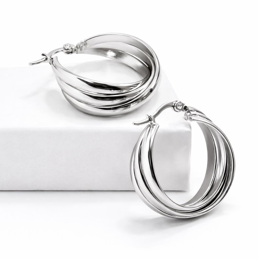 Small three-ring hoop earrings in silver-plated stainless steel.