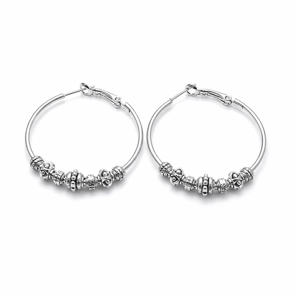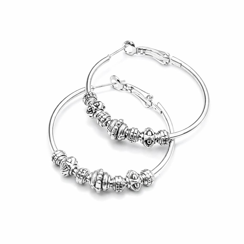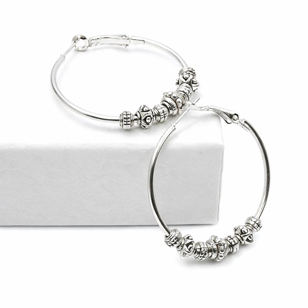 Superb hoop earrings in 925 silver plated brass adorned with beads and washers in antique silver brass.