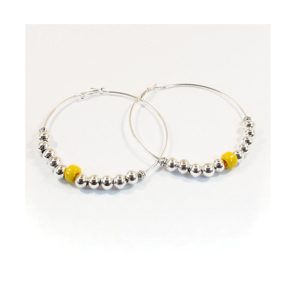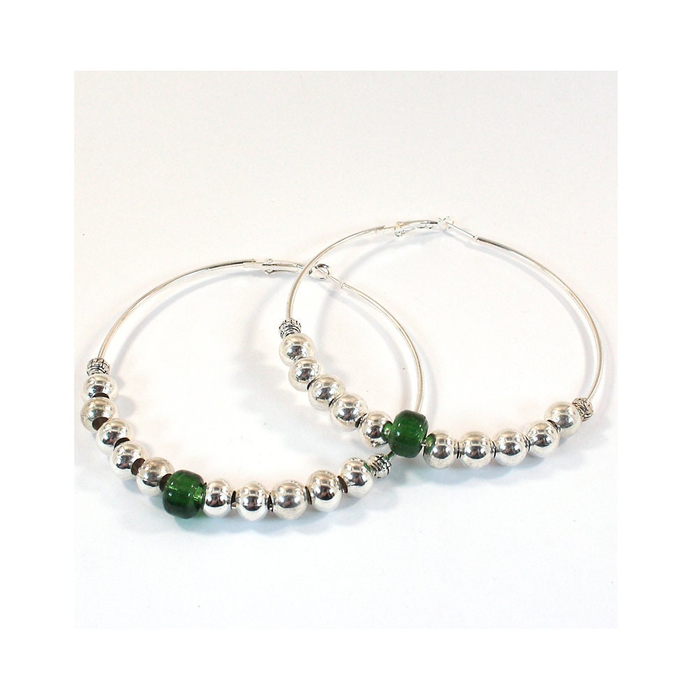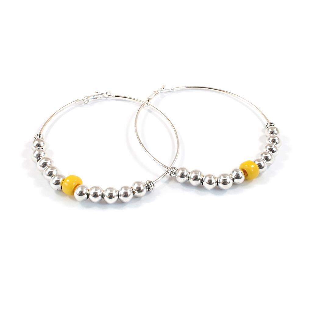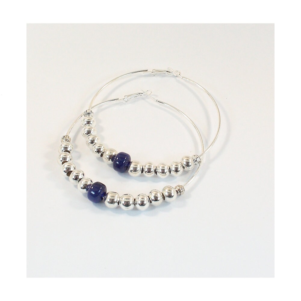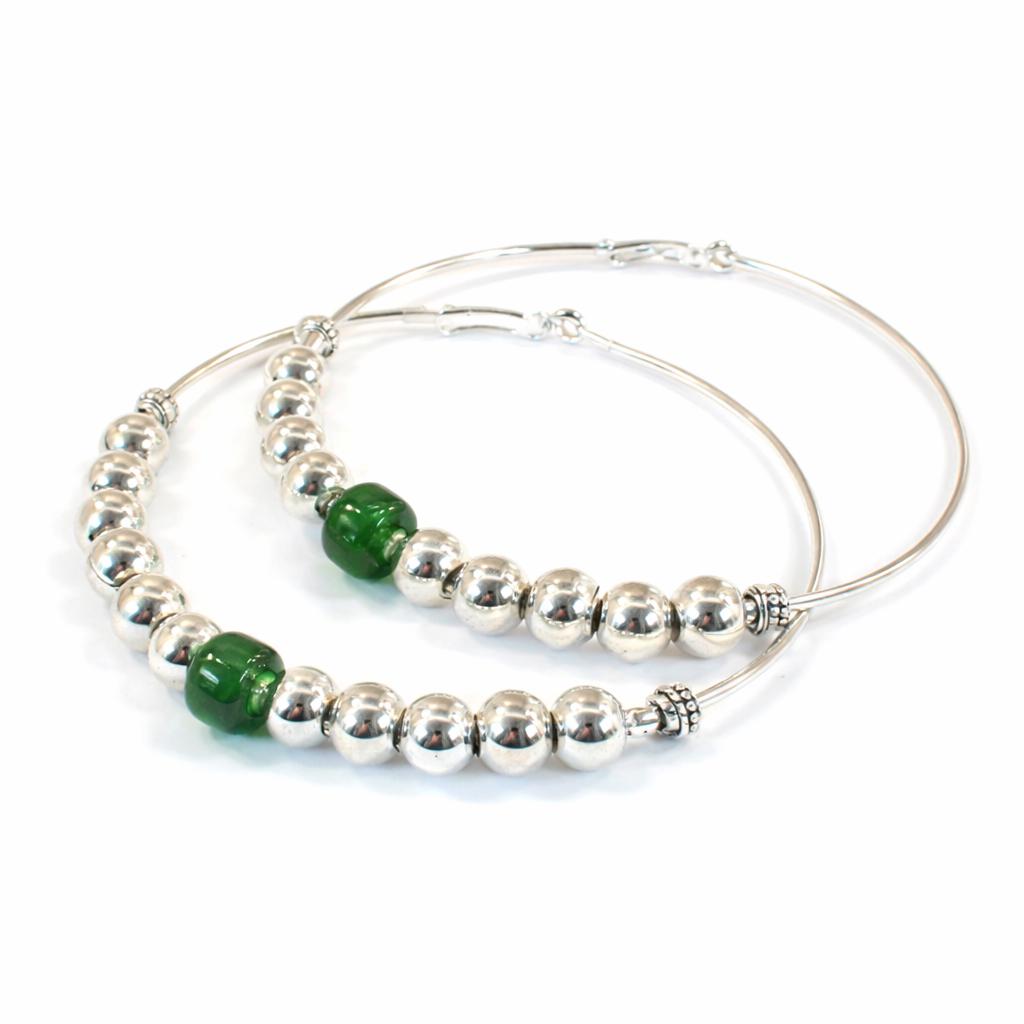 Superb XXL hoop earrings in 925 silver-plated brass decorated with round silver-plated brass beads and a recycled Indian glass bead.