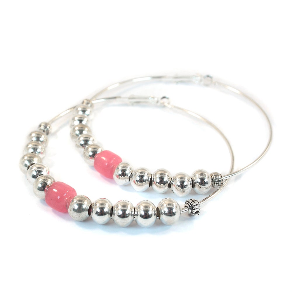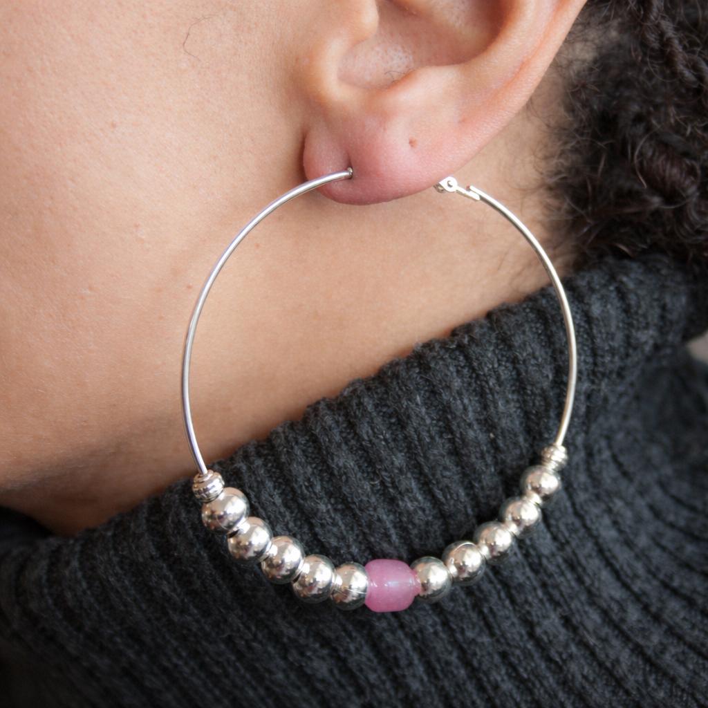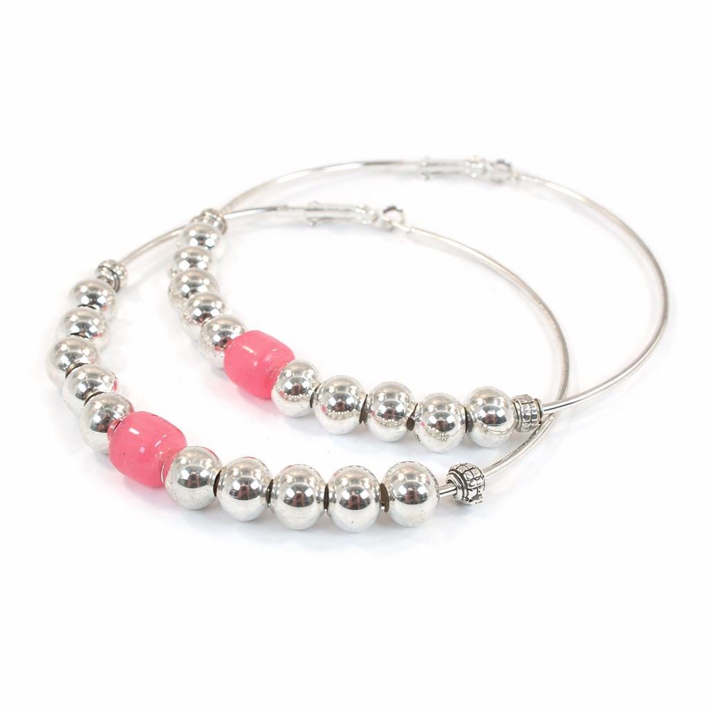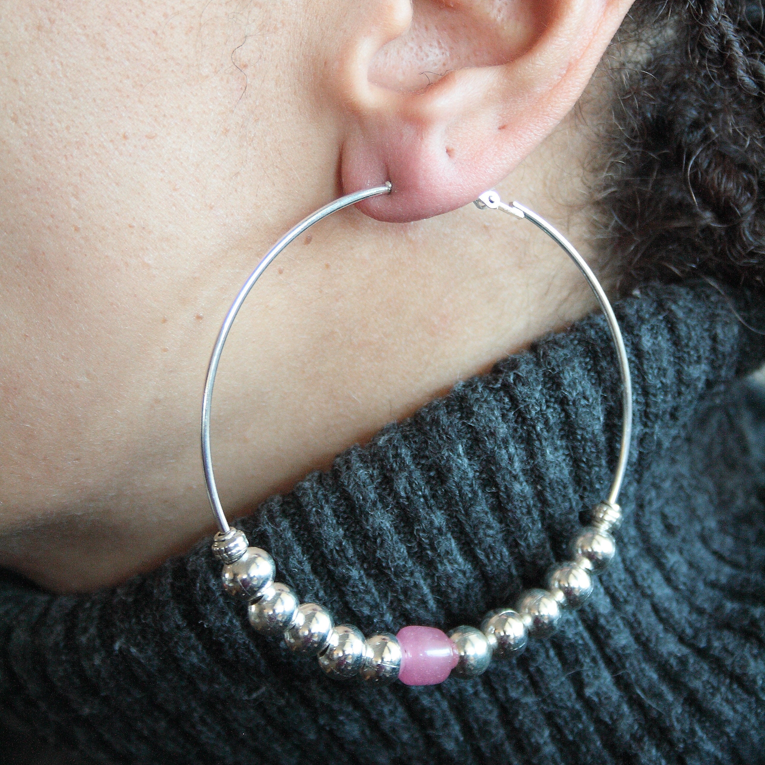 Superb XXL hoop earrings in 925 silver-plated brass decorated with round silver-plated brass beads and a recycled Indian glass bead.