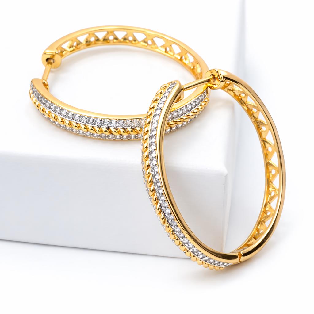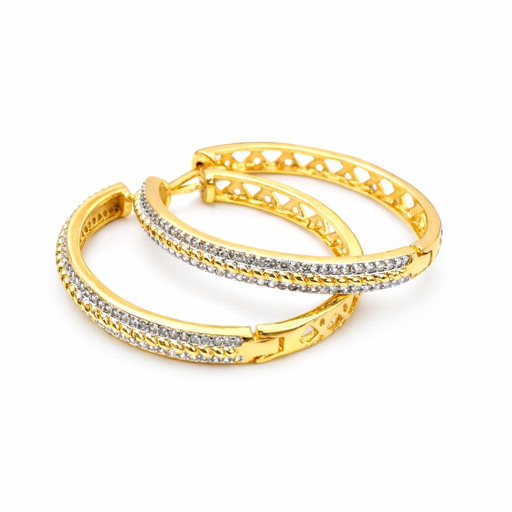 Gold-plated brass hoop earrings adorned with rhinestones.