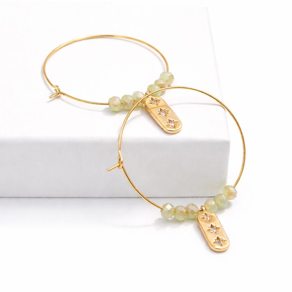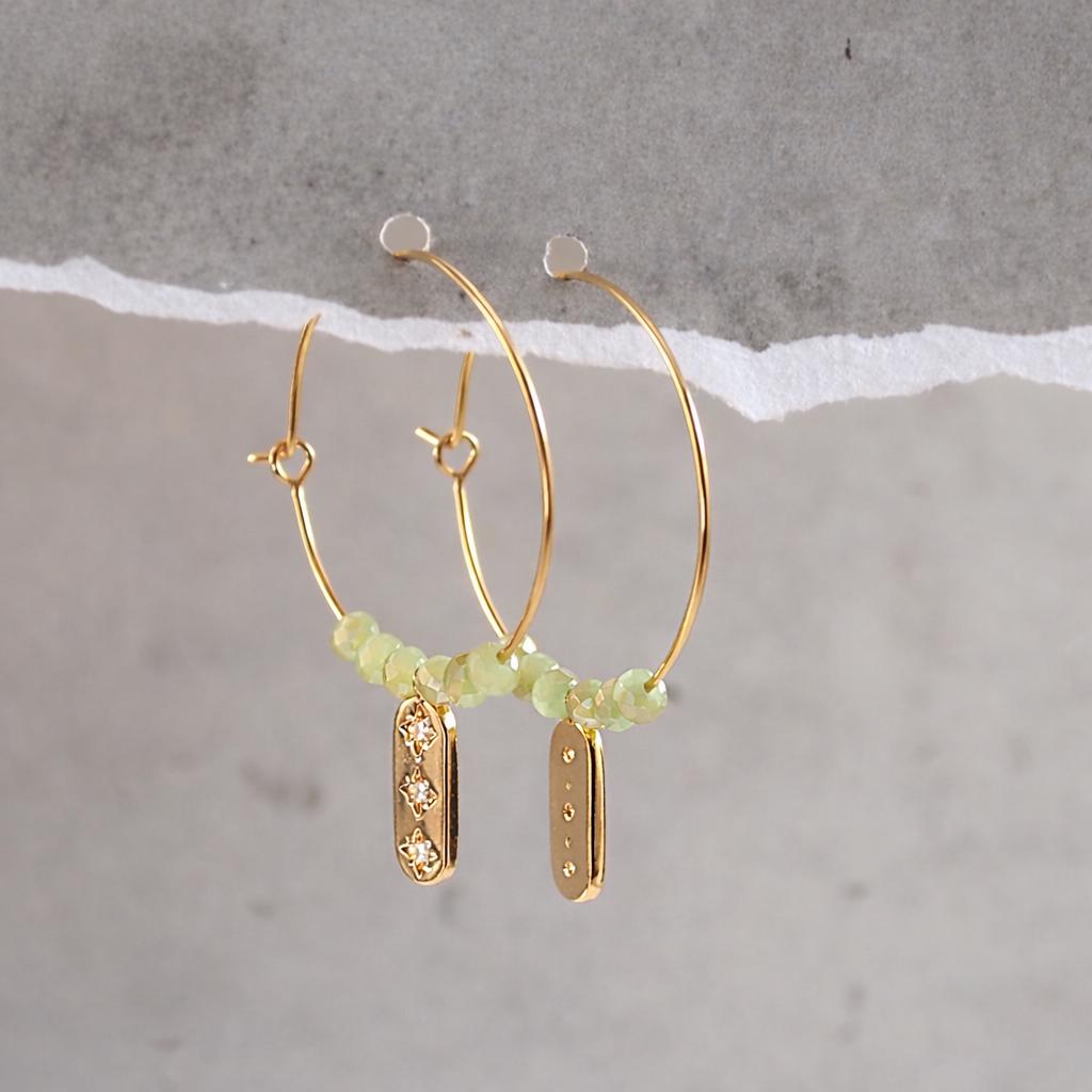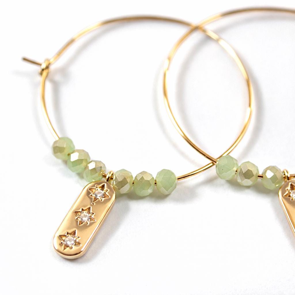 Hoop earrings created from a 24K gold-plated brass ring, green faceted glass beads and a 24k gold-plated brass "charm" adorned with zircon rhinestones.