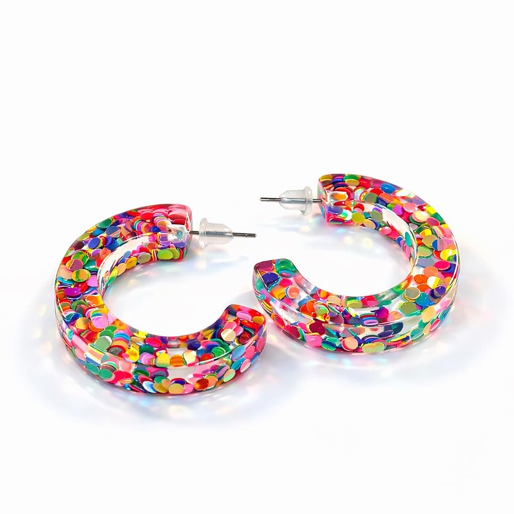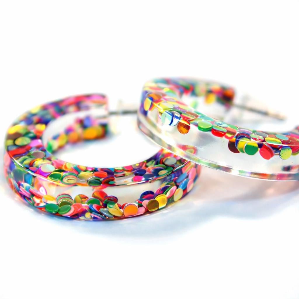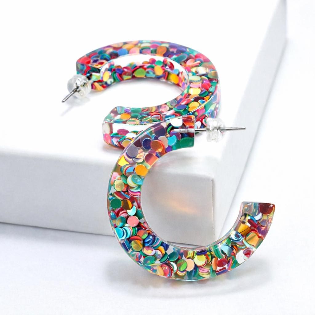 Half-hoop earrings in transparent resin and colored sequins.