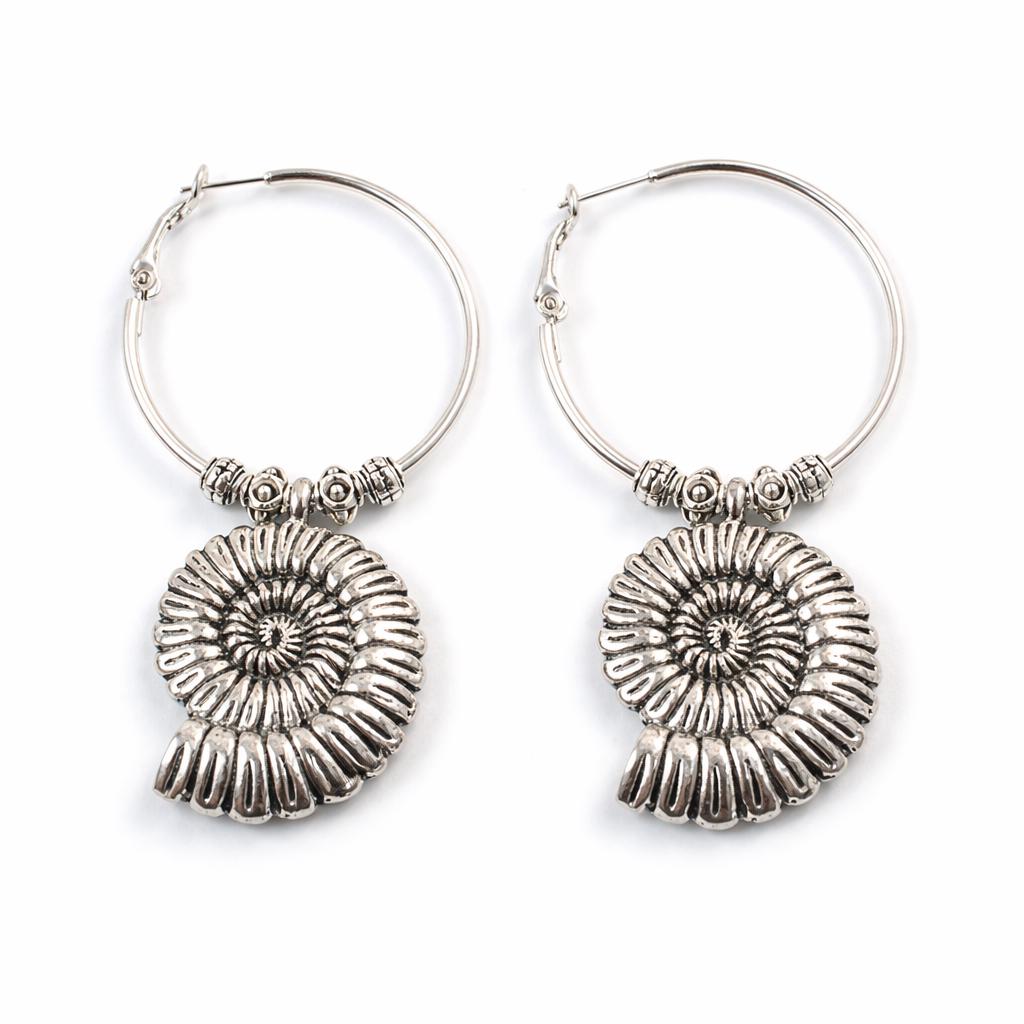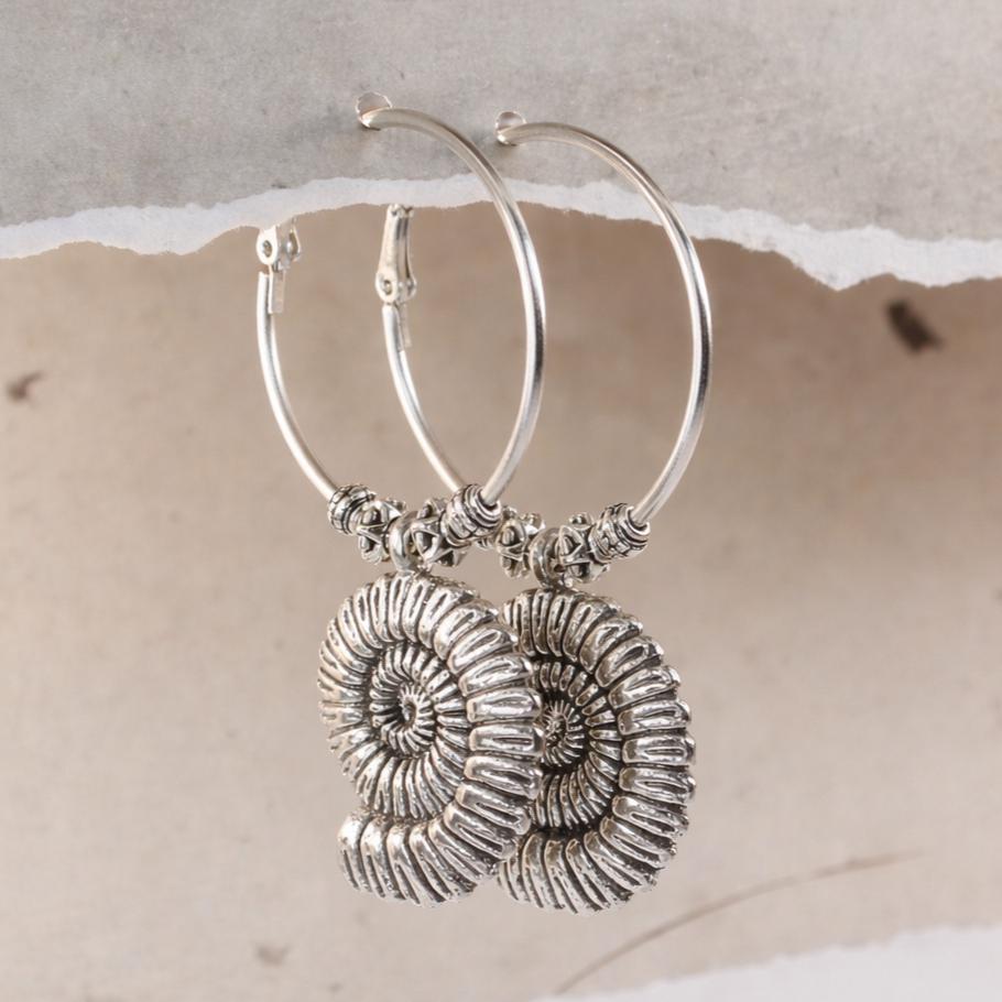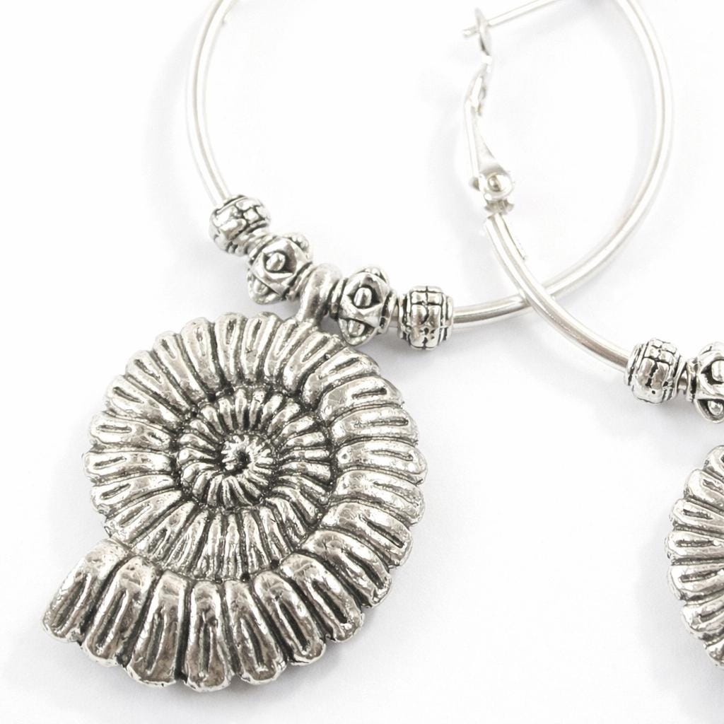 Silver-plated brass hoop earrings adorned with ornate silver-plated brass beads and an "old silver" brass "shell" tassel.