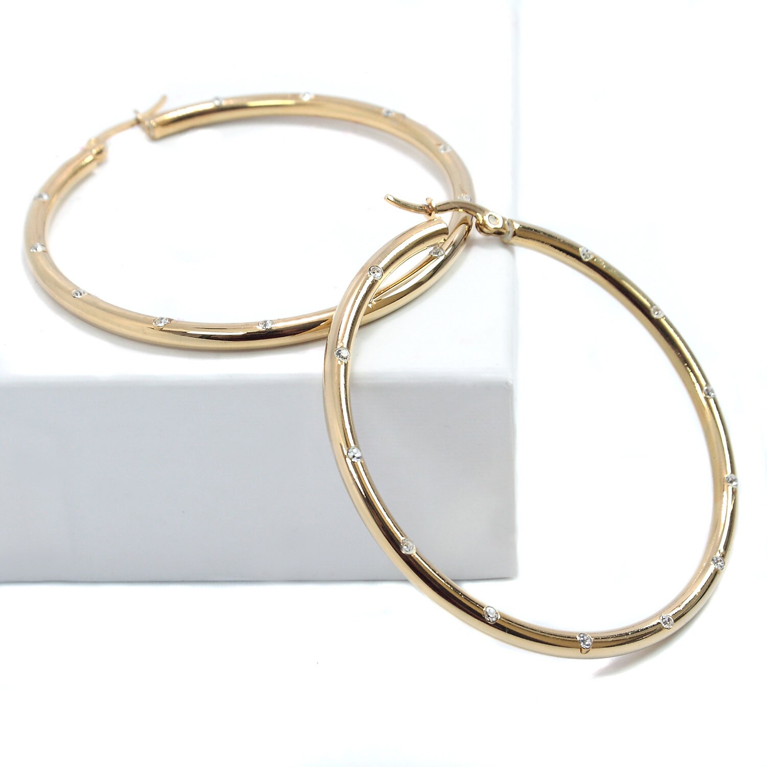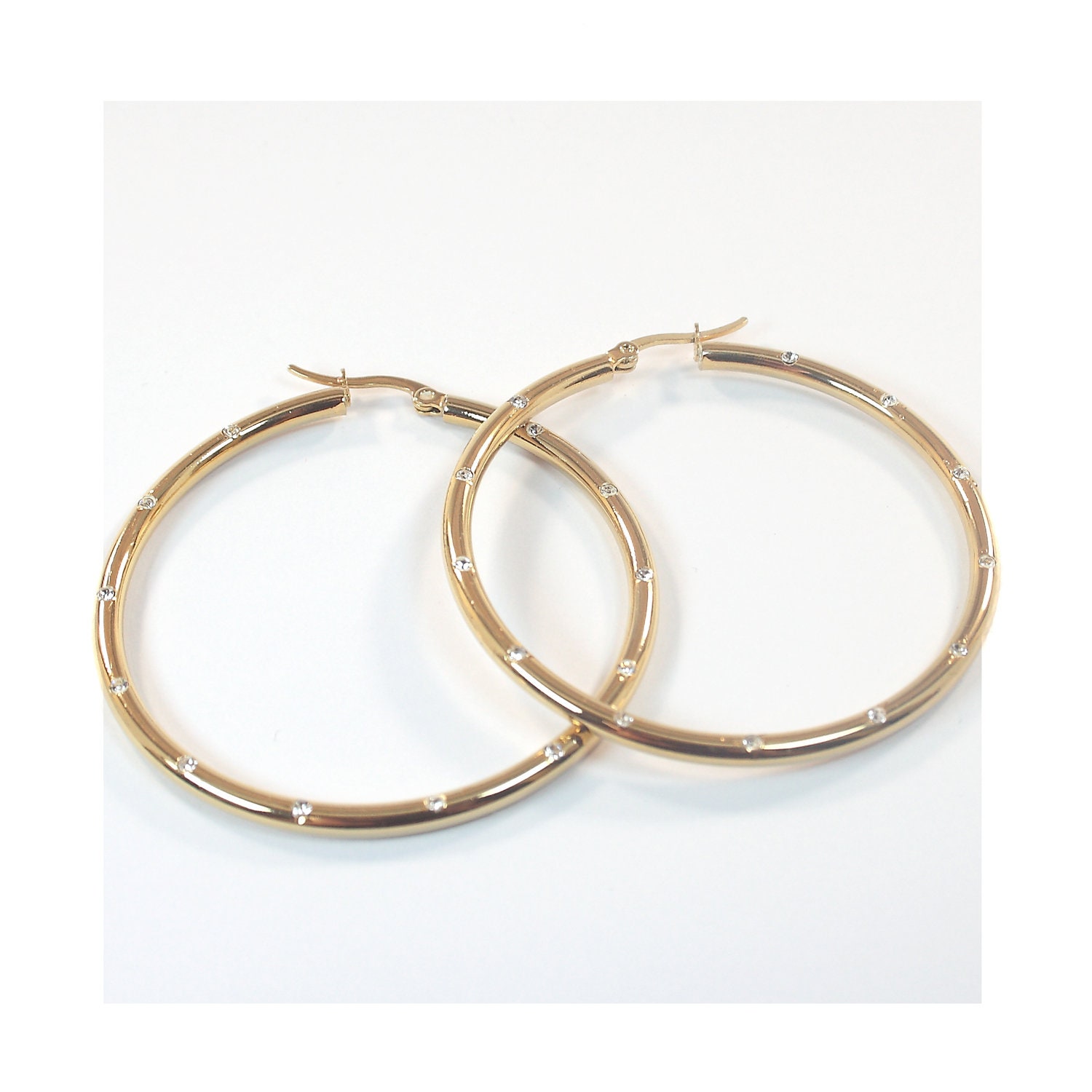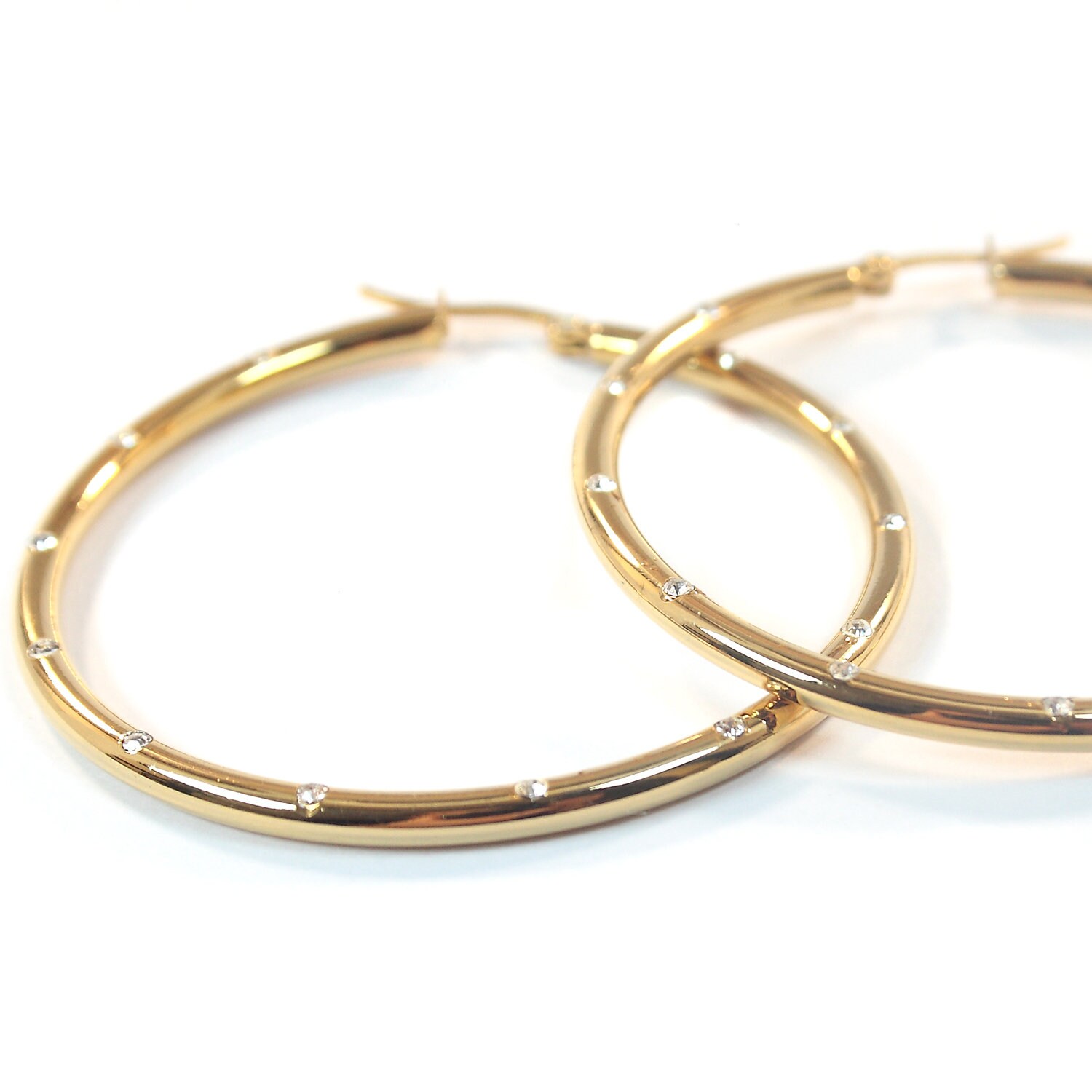 Gold-plated stainless steel and rhinestone hoop earrings.