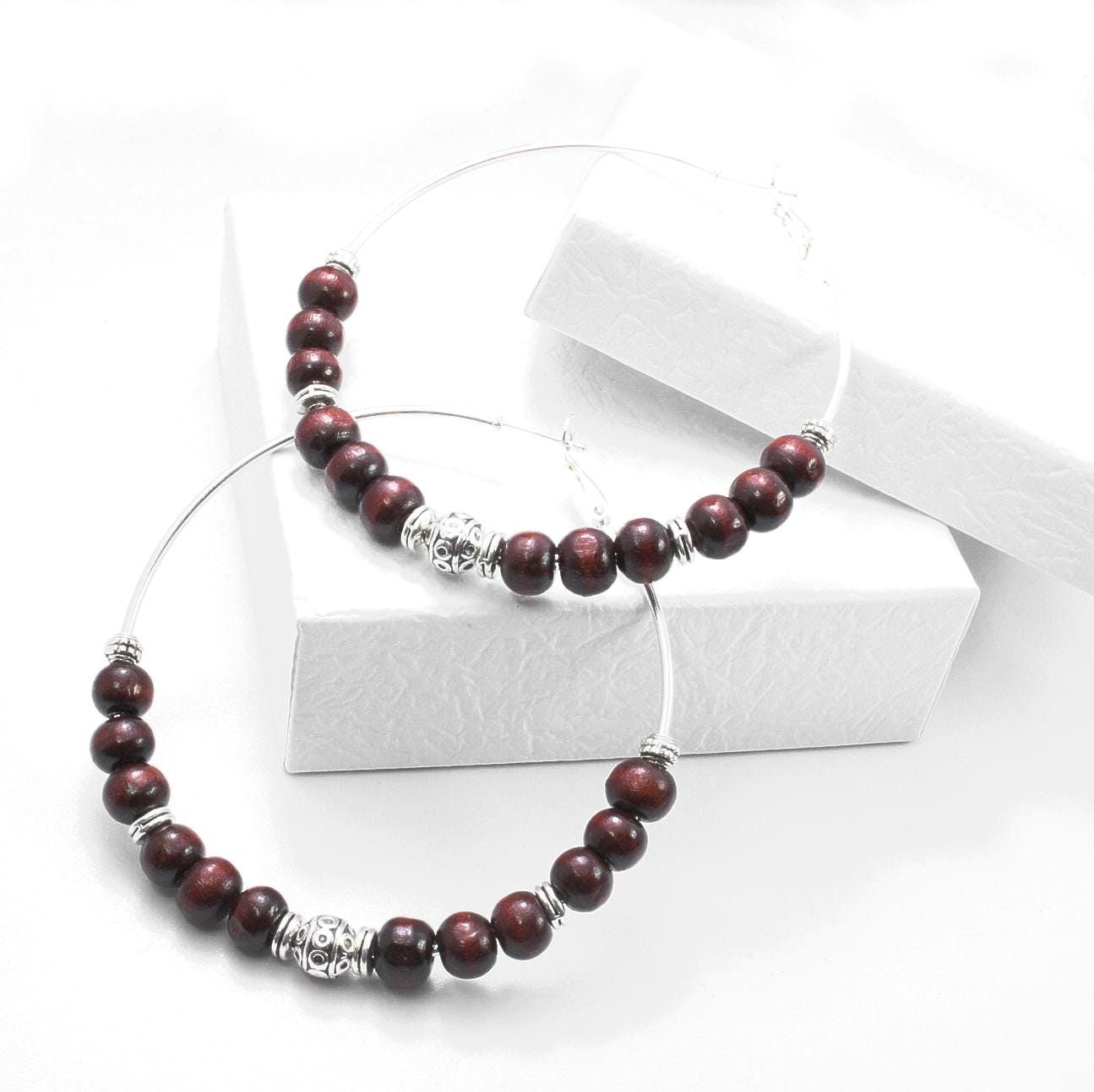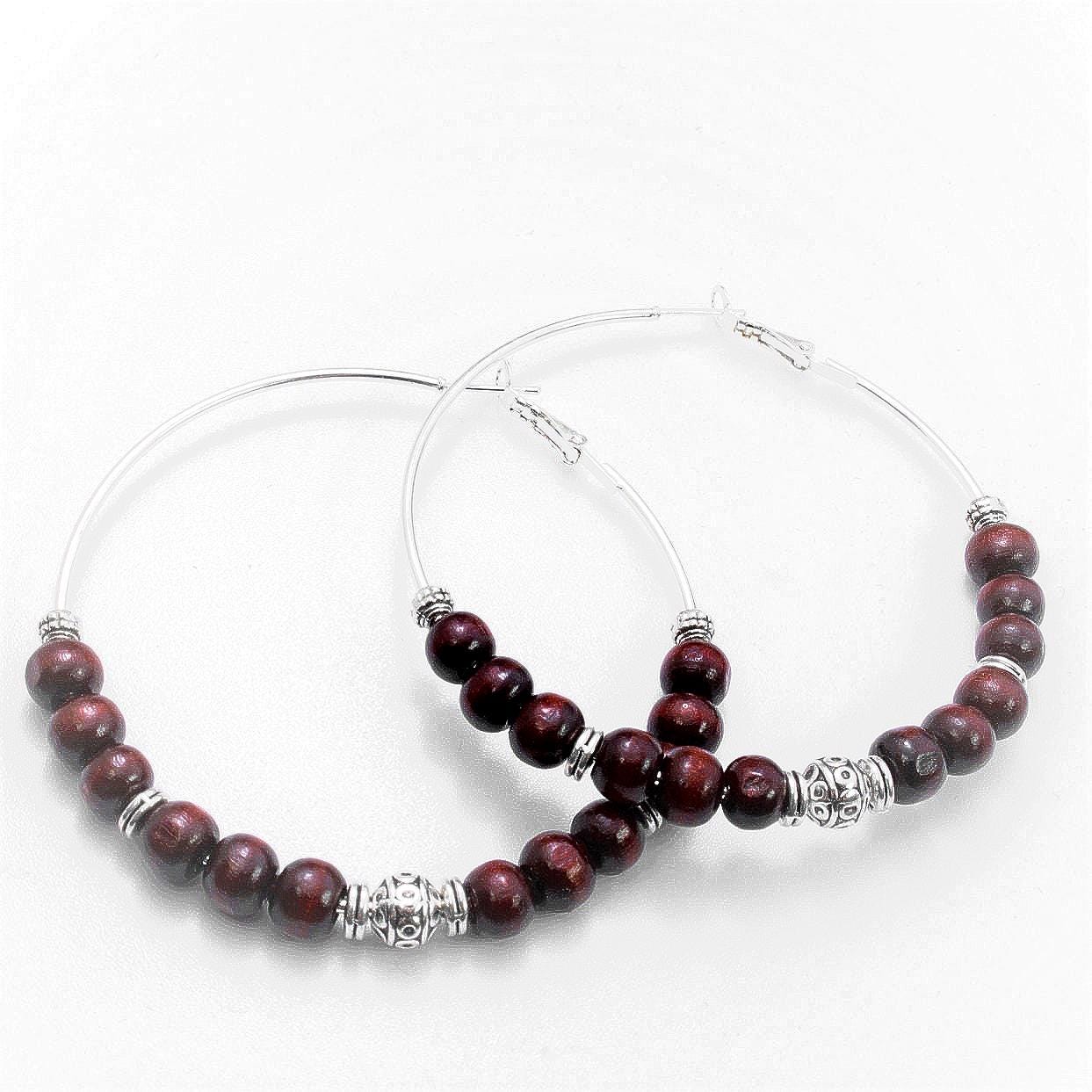 Boucles d'oreilles créoles XXL en laiton argent, garnies de perles en bois et de de mini perles en laiton vieil argent.