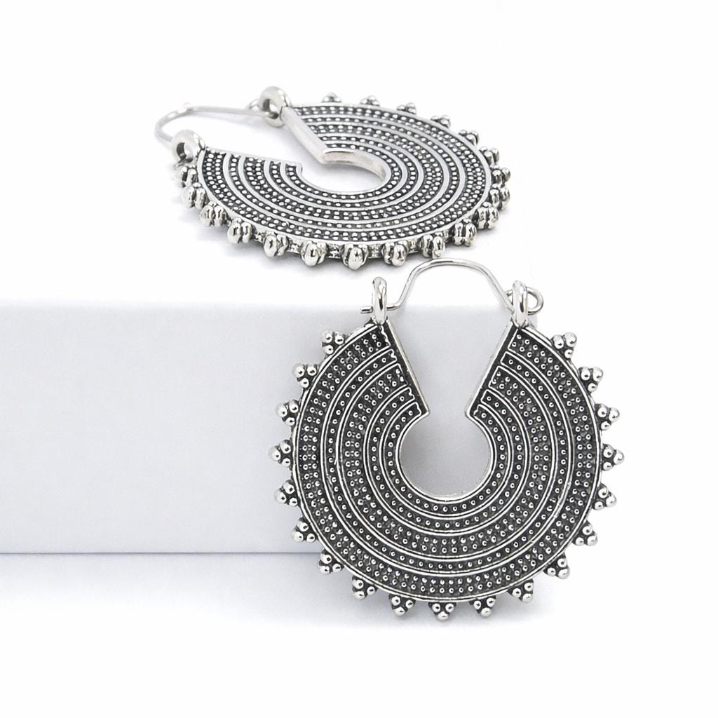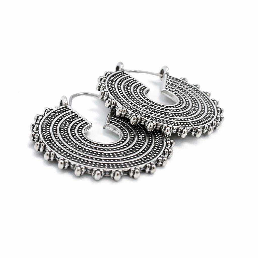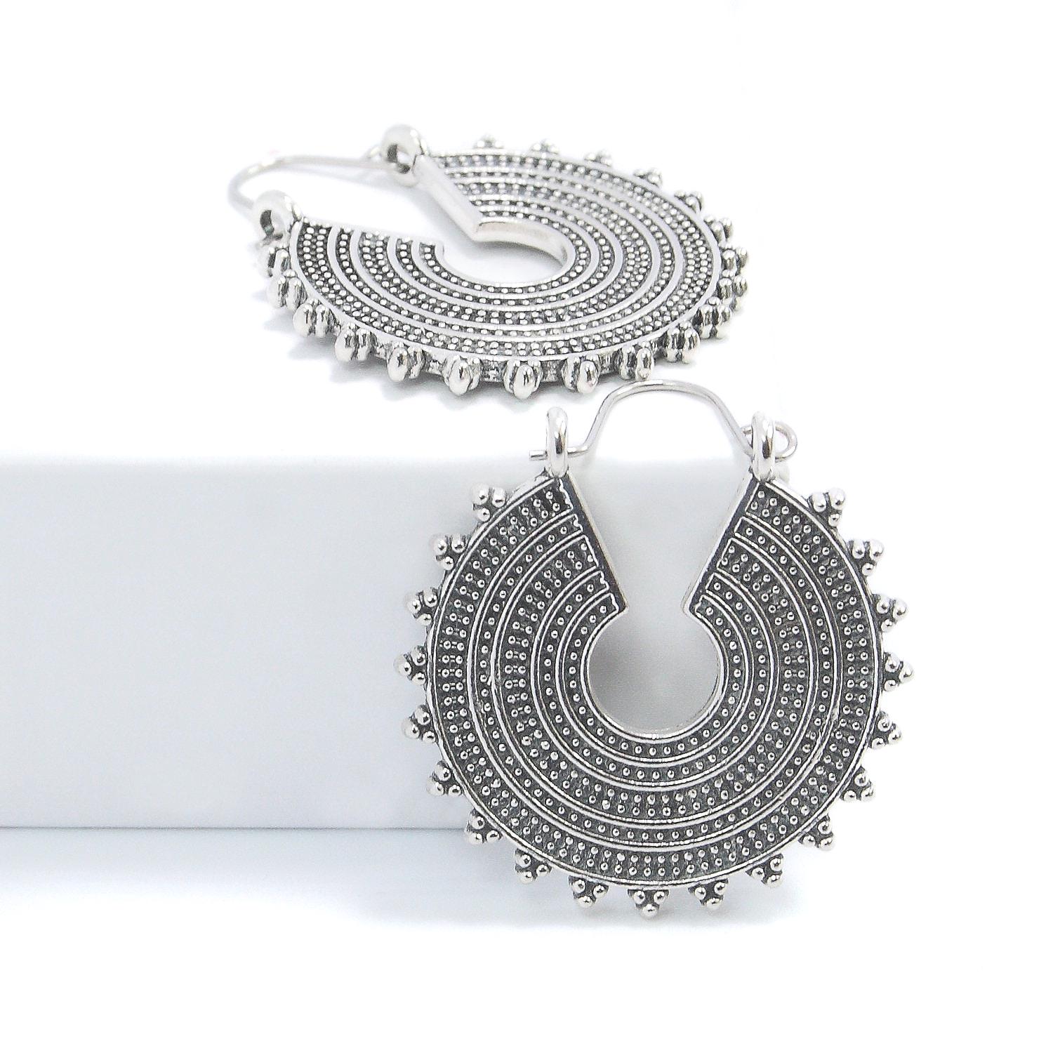 Silver-plated brass drop hoop earrings in ethnic style.