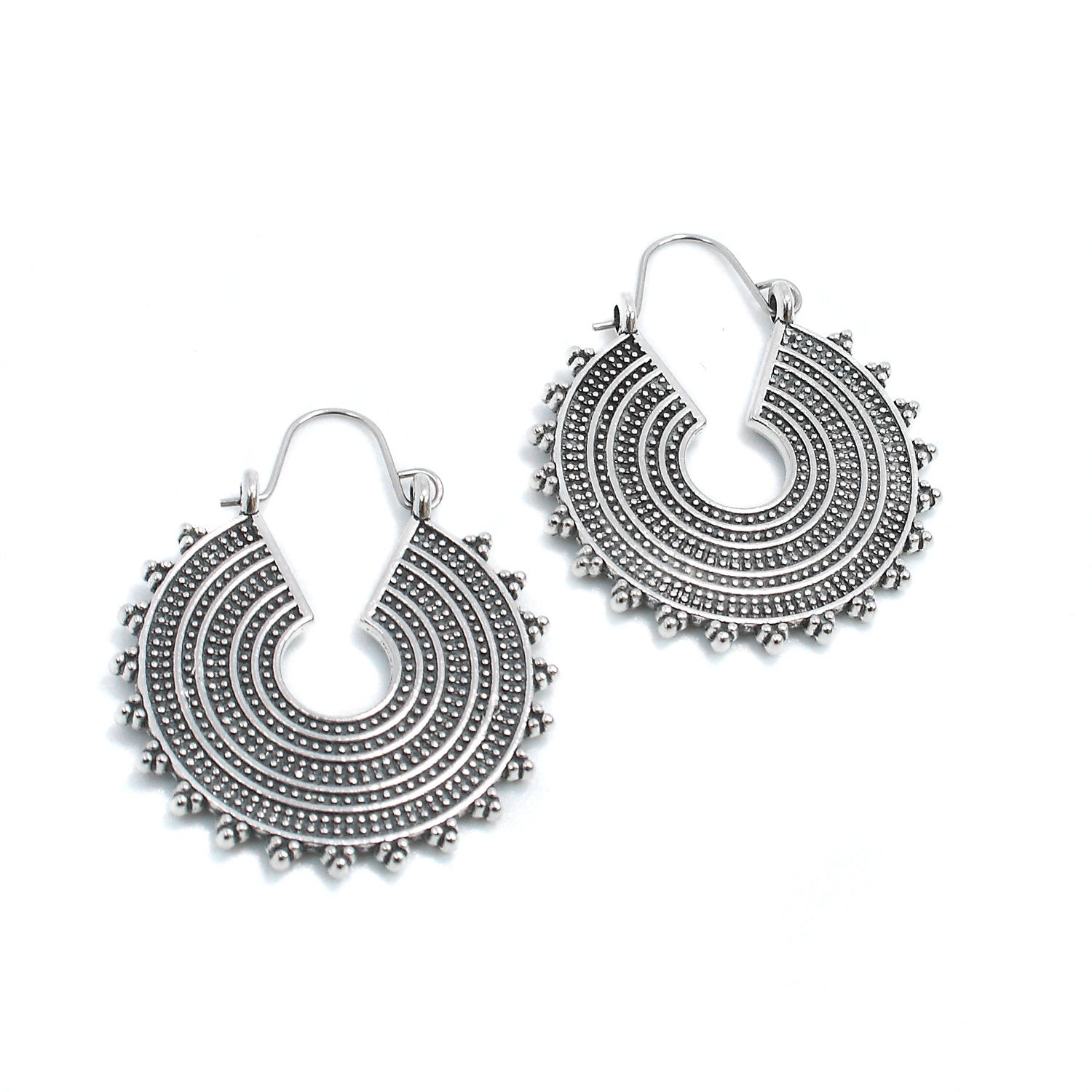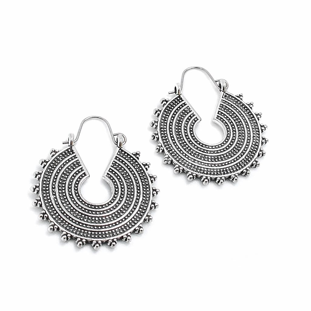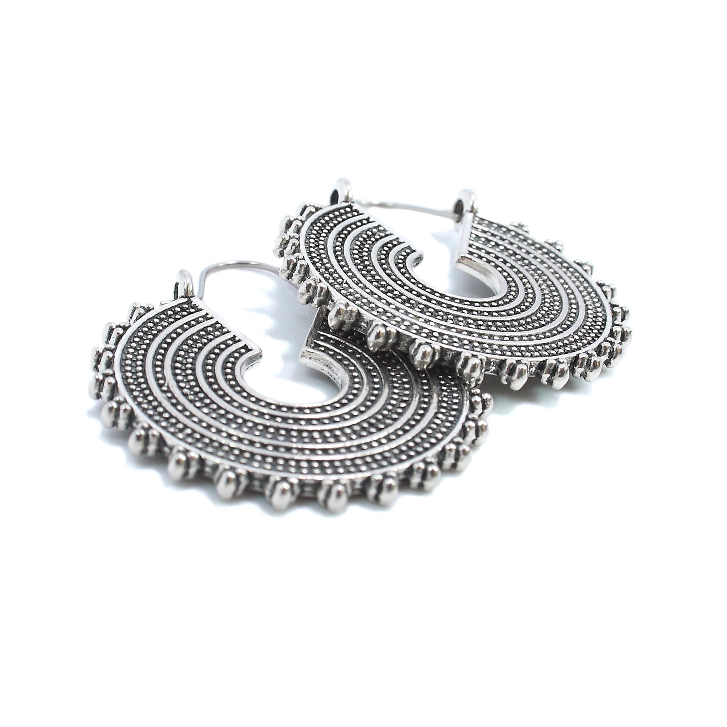 Silver-plated brass drop hoop earrings in ethnic style.