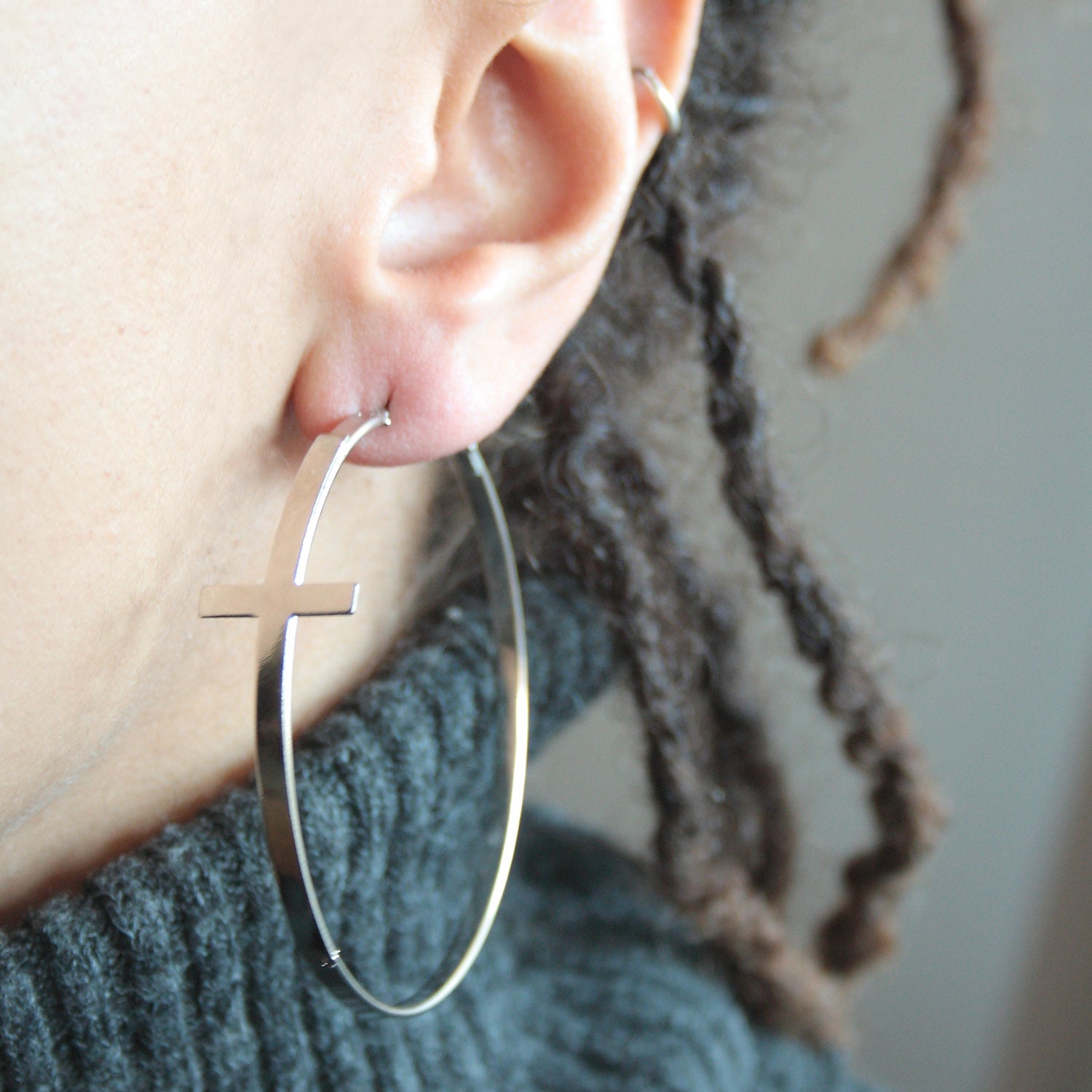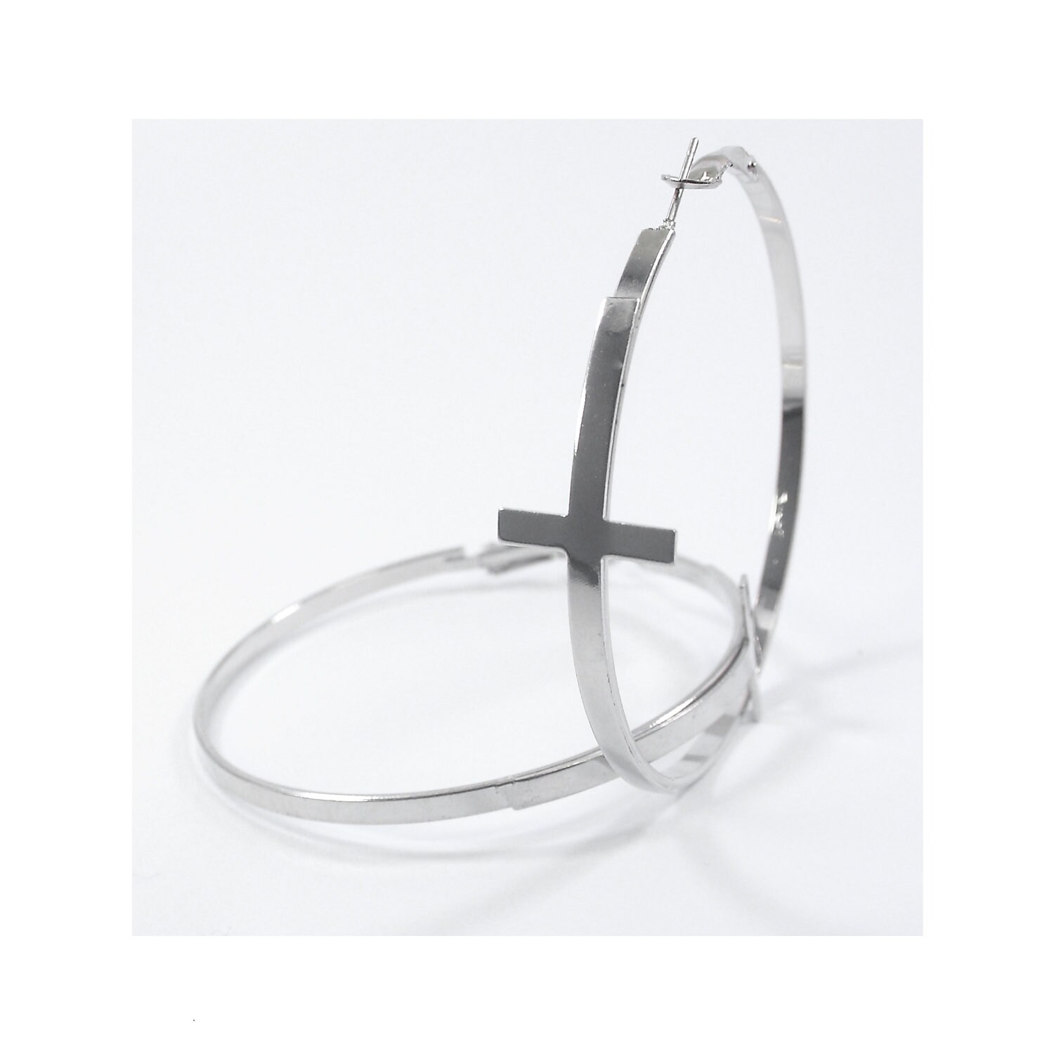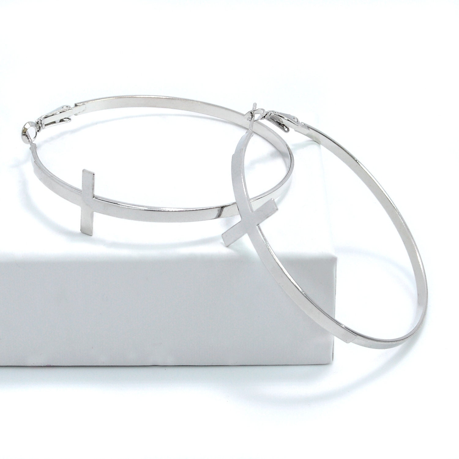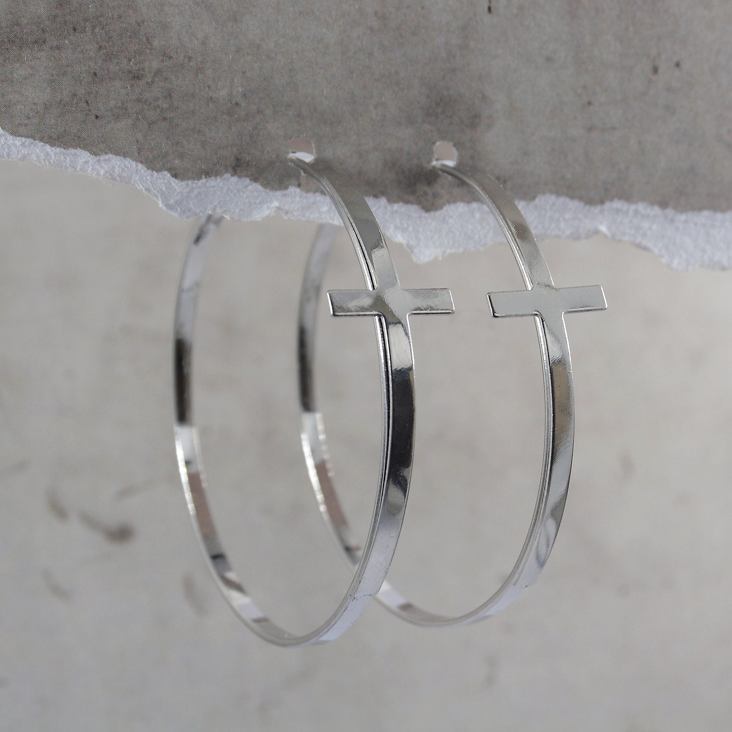 Silver cross hoop earrings in silver-plated brass.