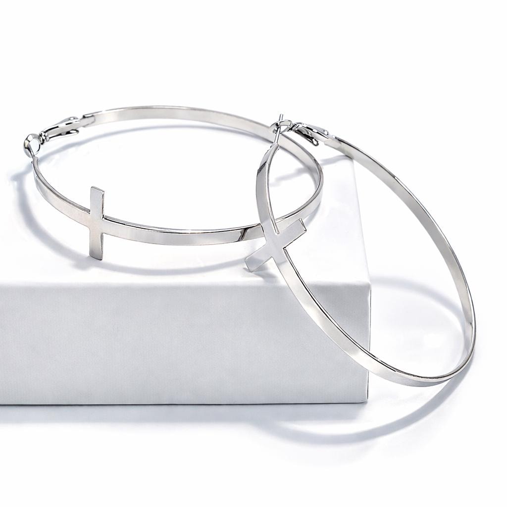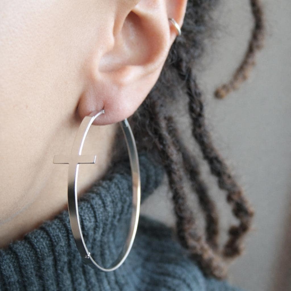 Silver cross hoop earrings in silver-plated brass.