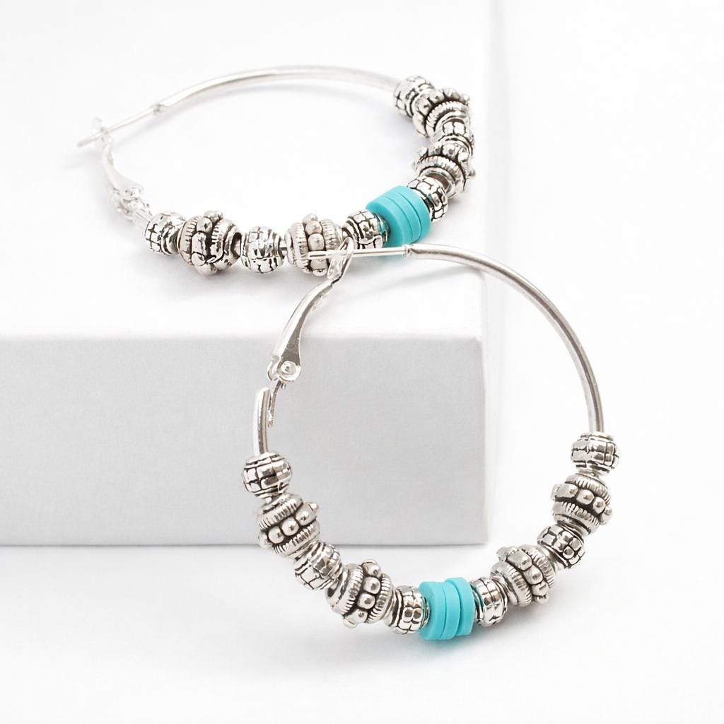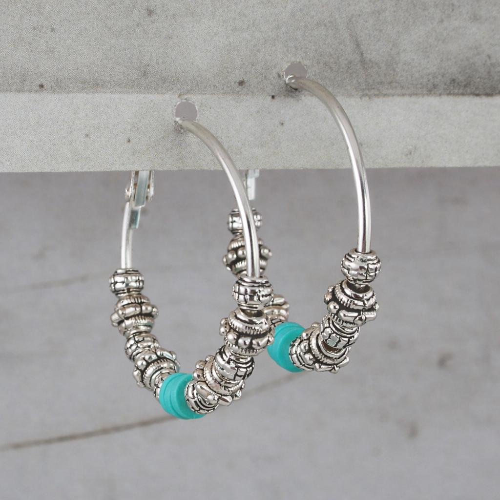 Silver-plated brass hoop earrings adorned with a set of metal beads and blue silicone washers.